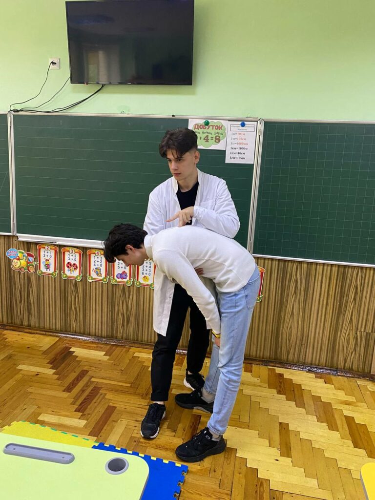 Гуртківці також продемонстрували базові способи допомоги при обструкції дихальних шляхів, при нападі епілепсії, інсульті, продемонстрували швидкі та ефективні методи зупинки кровотеч різної локалізації, а також надали вчителям можливість у практиці закріпити отримані знання на манекенах.