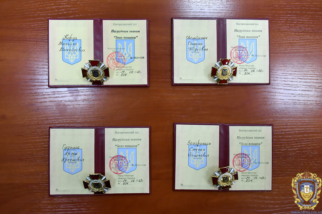 Цю роботу Тернопільського медуніверситету гідно оцінено на загальнодержавному рівні. Міністр оборони України Олексій Рєзніков нагородив нагрудним знаком «Знак пошани» ректора Тернопільського національного медичного університету Михайла Корду, проректора з науково-педагогічної та лікувальної роботи Степана Запорожана, завідувача кафедри екстреної та симуляційної медицини Арсена Гудиму і доцента кафедри екстреної та симуляційної медицини Галину Цимбалюк.