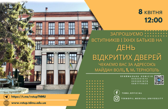 8 квітня 2023 року о 12:00 запрошуємо вступників і їх батьків на День відкритих дверей в Тернопільському національному медичному університеті, який відбудеться наживо за адресою: Майдан Волі, 1, Тернопіль.