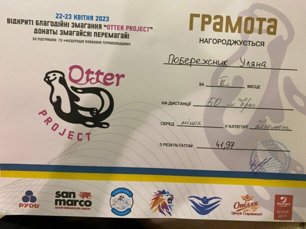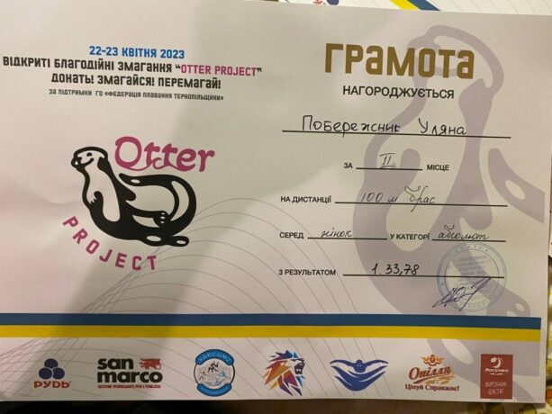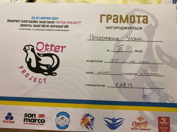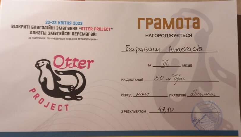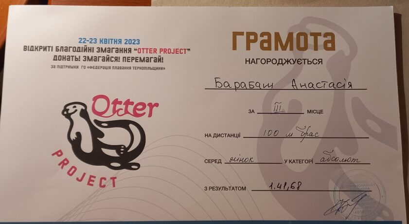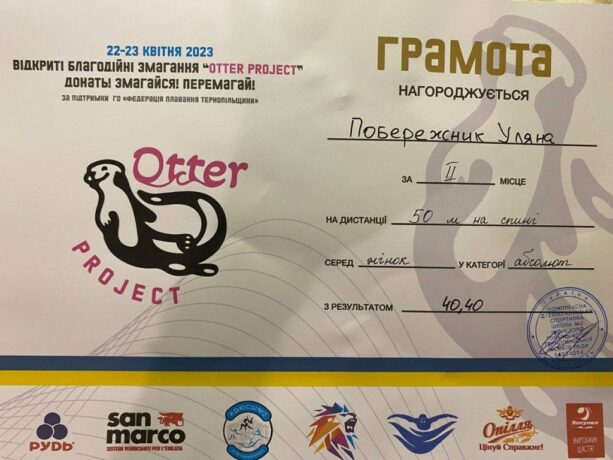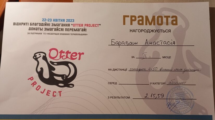 22-23 квітня 2023 року в басейні КДЮСШ імені Ю.Горайського у Тернополі відбувся відкритий благодійний турнір з плавання «Otter project», на якому було зібрано 62000 грн на потреби ЗСУ. На цих змаганнях команда Тернопільського національного медичного університету імені І.Горбачевського посіла друге місце в естафетному плаванні 4 по 50 метрів вільним стилем (змішана) у категорії «Абсолют». У складі команди ТНМУ виступали студент другого курсу Сергій Остроушко (ММ-205), студентка першого курсу Уляна Побережник (ММ-107), лікар-інтерн Анастасія Барабаш (кафедра терапії і сімейної медицини факультету післядипломної освіти), Віктор Назарук (кафедра фізичної терапії, ерготерапії та фізичного виховання).