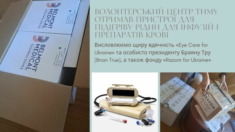 Президент благодійної організації «Eye Care for Ukraine» Браян Тру (Brian True) передав волонтерському центру Тернопільського національного медичного університету спеціальні пристрої, які забезпечують підігрів рідин для інфузій і препаратів крові для переливання у польoвих умовах.