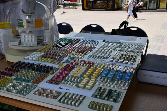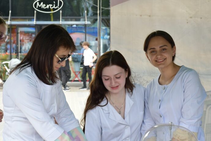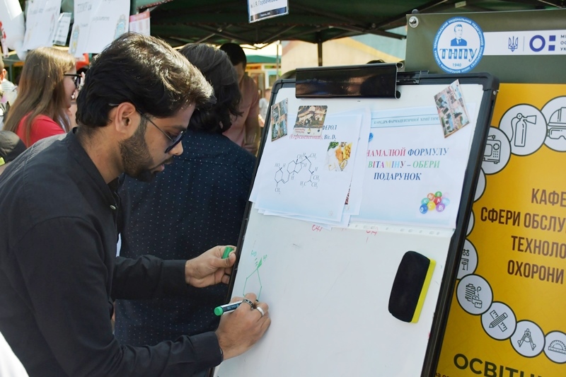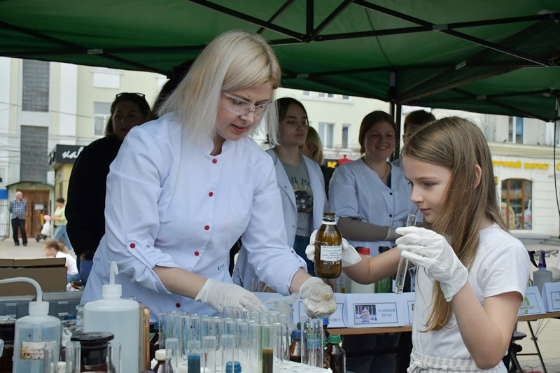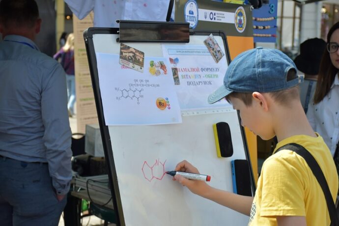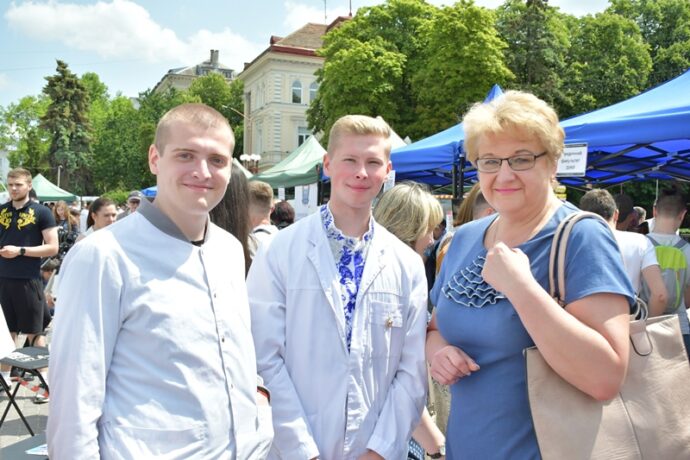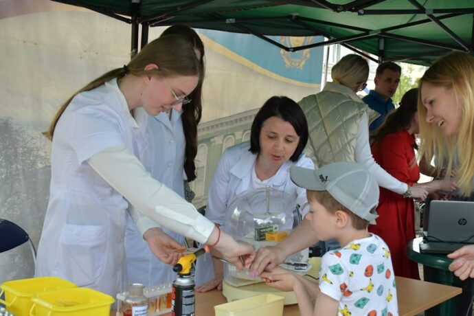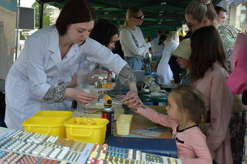 Багато відвідувачів було біля стендів фармацевтичного факультету. Команда кафедри управління та економіки фармації з технологією ліків у складі доцентів Наталії Белей, Мар’яни Васенди і студентів Юлії Мельничук, Наталії Хомин, Ангеліни Кліменчук, Ангеліни Мельник продемонстрували деякі етапи виробництва розчинів для ін’єкцій в ампулах, зокрема наповнення і запаювання капілярів шляхом їх оплавлення і відтягування.  На очах глядачів відбувалася справжня магія, а тому учасники шикувалися в чергу, аби спробувати, яке воно – м’яке скло? Також у відвідувачів була можливість візуально ознайомитися з різними типами твердих лікарських форм, а саме таблеток без оболонки, таблеток покритих різними типами оболонок, каплетами, капсулами твердими і м’якими, а також спансулами. Важливо, що студенти наголошували діткам: якою б смачною та барвистою не виглядала таблетка, її без контролю дорослих вживати не можна. Багато містян цікавилися  особливостями будови, виробництва і способом застосування цих лікарських форм. Працівники університету і наші студенти розповідали про контроль якості таблеток і демонстрували визначення їх стійкості до роздавлювання.