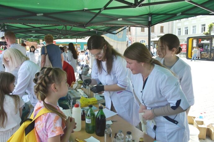 Багато відвідувачів було біля стендів фармацевтичного факультету. Команда кафедри управління та економіки фармації з технологією ліків у складі доцентів Наталії Белей, Мар’яни Васенди і студентів Юлії Мельничук, Наталії Хомин, Ангеліни Кліменчук, Ангеліни Мельник продемонстрували деякі етапи виробництва розчинів для ін’єкцій в ампулах, зокрема наповнення і запаювання капілярів шляхом їх оплавлення і відтягування.  На очах глядачів відбувалася справжня магія, а тому учасники шикувалися в чергу, аби спробувати, яке воно – м’яке скло? Також у відвідувачів була можливість візуально ознайомитися з різними типами твердих лікарських форм, а саме таблеток без оболонки, таблеток покритих різними типами оболонок, каплетами, капсулами твердими і м’якими, а також спансулами. Важливо, що студенти наголошували діткам: якою б смачною та барвистою не виглядала таблетка, її без контролю дорослих вживати не можна. Багато містян цікавилися  особливостями будови, виробництва і способом застосування цих лікарських форм. Працівники університету і наші студенти розповідали про контроль якості таблеток і демонстрували визначення їх стійкості до роздавлювання.