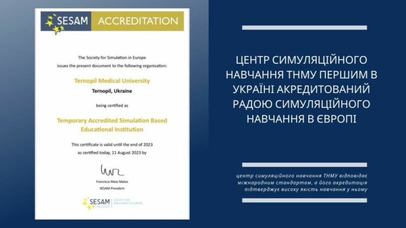 Центр симуляційного навчання Тернопільського національного медичного університету імені І.Горбачевського 11 серпня 2023 року отримав сертифікат про акредитацію Європейською радою симуляційного навчання (SESAM). Вперше в Україні центр, в якому студенти освоюють практичні навички за допомогою симуляційних технологій, має визнання європейського рівня. Це означає, що центр симуляційного навчання ТНМУ відповідає міжнародним стандартам, а його акредитація підтверджує високу якість навчання у ньому. Європейська рада симуляційного навчання є незалежним органом і визнаним міжнародним лідером громадської думки в галузі симуляційних методів навчання в охороні здоров’я.