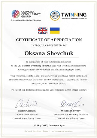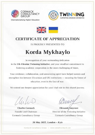 Щиро вдячні Чарльзу Кормаку та Cormack Consultancy group, Universities UK та Фонду Президента за ініціативу та підтримку. Університети Великобританії підтримали українські університети у важкий час – у період повномасштабного військового вторгнення Росії в Україну. Освіті належить виконувати важливу місію у відбудові України. З цією метою було започаткованого програми єднання.