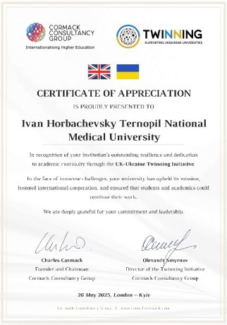 Щиро дякуємо за співпрацю і підтримку Professor Margaret Kingston, Director of Undergraduate Medical Studies, Keith Brennan, Vice Dean for Internationalisation, Dr Silke Conen, Professor Jess Grundy, Dr. Steven Thomson та усім небайдужим