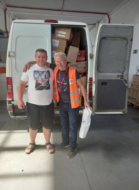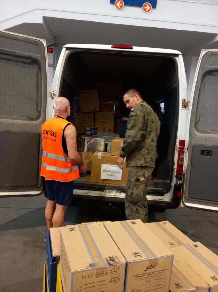 Завантаження гуманітарної допомоги ( волонтери Тарас Равлів та Кшиштоф Анджеєвський).