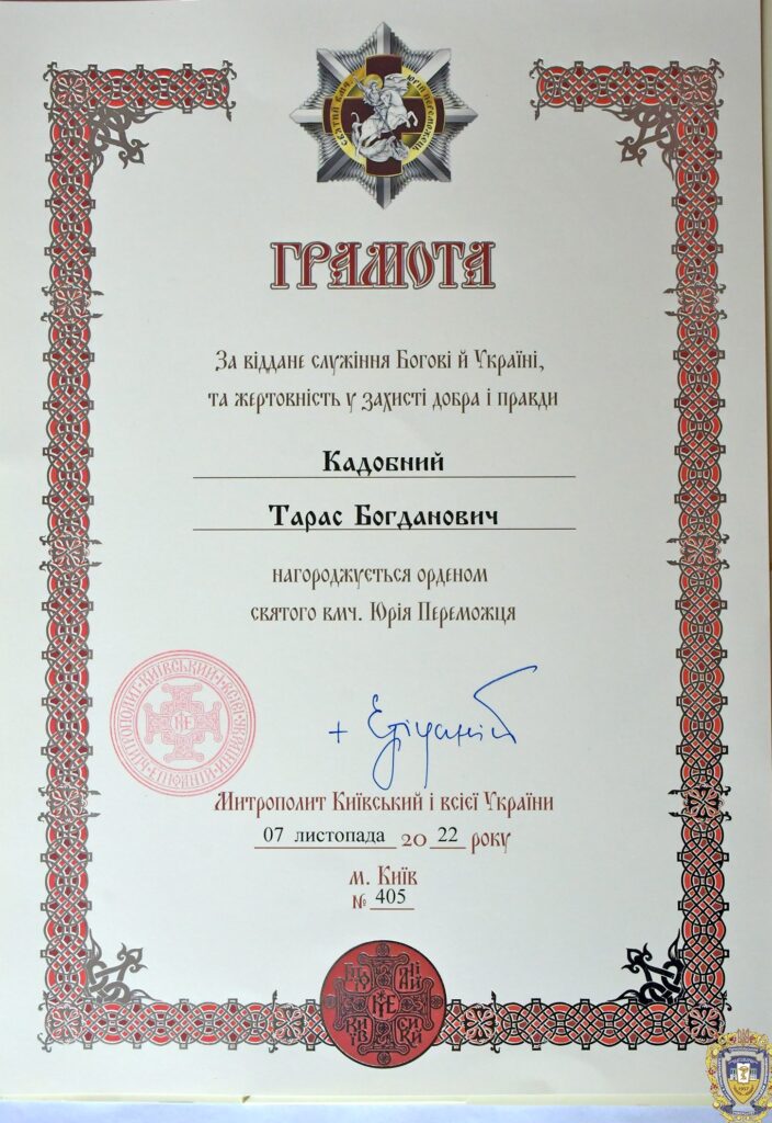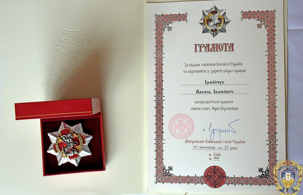 Під час цьогорічних Михайлівських днів активних членів ГО «Інститут досліджень національної спадщини» Тараса Кадобного та Василя Ірмійчука було нагороджено «Орденом святого великомученика Юрія Переможця» від Православної церкви України за активну громадську позицію, національно-патріотичну діяльність з молоддю, популяризацію української культури за межами України, активний волонтерський рух, всебічну допомогу бійцям ЗСУ, дослідження та встановлення пам’ятних дошок українським героям в боротьбі з тоталітаризмом.