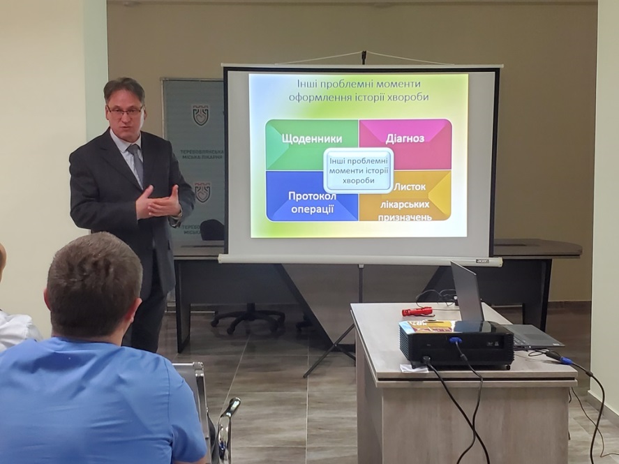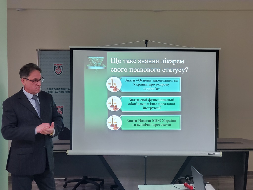 Реалізовуючи важливу складову в діяльності викладачів клінічних кафедр – проведення професійно-орієнтованих навчань з практичним лікарями, професор кафедри патологічної анатомії з секційним курсом та судовою медициною, завідувач курсу судової медицини ТНМУ, доктор медичних наук Валентин Франчук 25 січня 2023 року провів в Теребовлянській міській лікарні науково-практичний семінар на тему «Як практичному лікарю запобігти судовим позовам?».