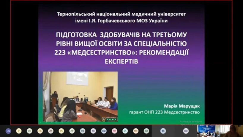 Від колективу авторів Тернопільського національного медичного університету Кліщ І. М., Мазур Л. П., Криницька І. Я. результати роботи представила Марія Марущак у доповіді «Підготовка здобувачів на третьому рівні вищої освіти за спеціальністю 223 «Медсестринство»: Рекомендації експертів».