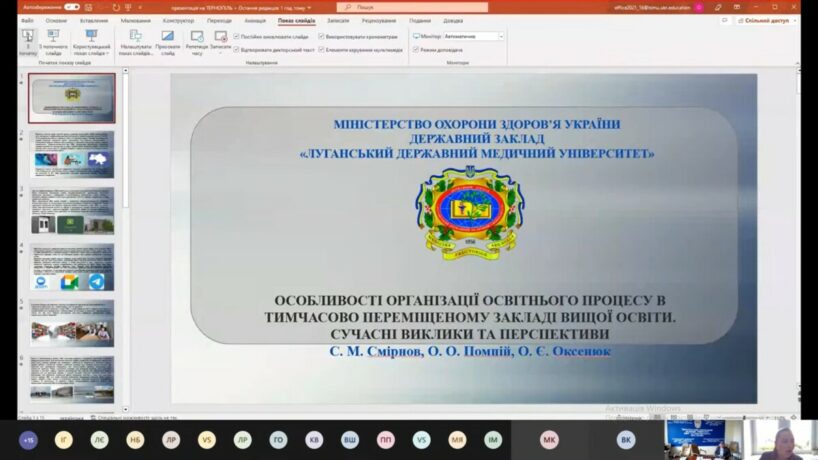 Доповідачка з Луганського державного медичного університету Оксана Оксенюк поділилася досвідом у виступі «Особливості організації освітнього процесу в тимчасово переміщеному закладі вищої освіти. Сучасні виклики та перспективи». До складу авторів увійшли Смірнов С. М., Помпій О. О.