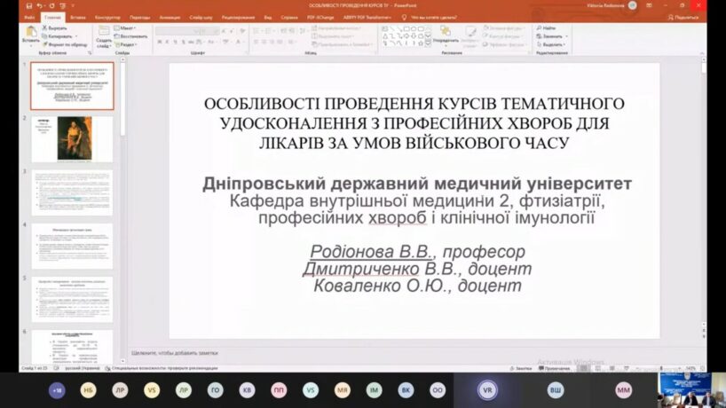 Вікторія Родіонова (Дніпровський державний медичний університет) доповіла на тему «Особливості проведення курсів тематичного удосконалення з професійних хвороб для лікарів за умов військового часу». До складу авторів увійшли Дмитриченко В. В., Коваленко О. Ю.