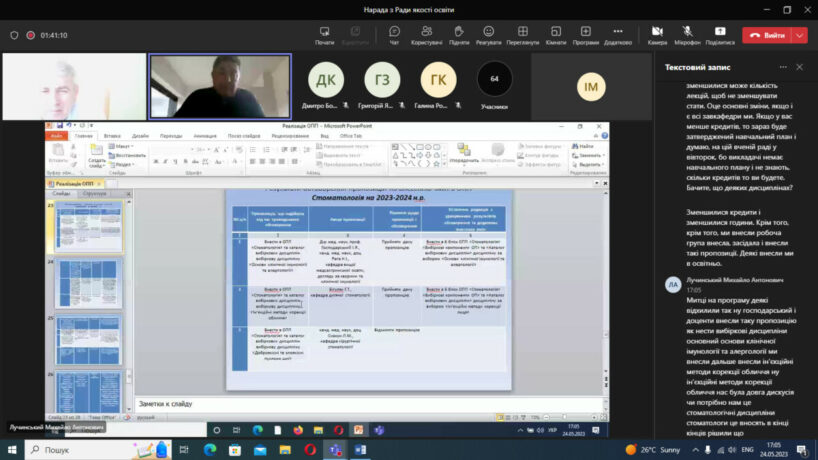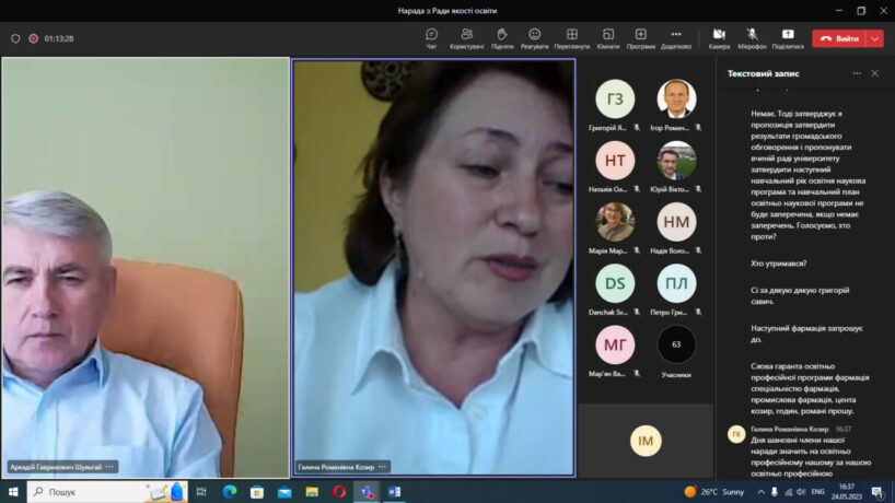 У засіданні прийняли участь голова Ради із забезпечення якості, проректор з науково-педагогічної роботи, проф. А.Шульгай, заступник голови Ради із забезпечення якості, представник ректора з питань якості, доц. Г.Загричук, секретар Ради із забезпечення якості, керівник навчального відділу доц. А.Машталір, гаранти освітньо-професійних програм другого (магістерського) рівня вищої освіти: “Лікувальна справа” – завідувачка кафедрою фармакології з клінічною фармакологією, проф. О.Олещук, “Фармація” – доцентка кафедри управління та економіки фармації з технологією ліків Г.Козир, “Стоматологія” – завідувач кафедрою терапевтичної стоматології, проф. М.Лучинський, “Громадське здоров’я” – т.в.о. кафедри громадського здоров’я та управління охороною здоров’я, проф. Н.Теренда, “Фізична терапія” – викладач кафедри медичної реабілітації Ю.Завіднюк, “Сестринська справа” – директорка навчально-наукового інституту медсестринства, доц. С.Даньчак, гаранти освітньо-наукових програм: “Фармація” – декан фармацевтичного факультету, доц. Д.Коробко, “Стоматологія” – завідувач кафедрою дитячої стоматології, проф. О.Авдєєв, “Педіатрія” – завідувачка кафедрою дитячих хвороб з дитячою хірургією, проф. О.Боярчук, “Медсестринство” – завідувачка кафедрою функціональної і лабораторної діагностики, проф. М.Марущак, “Біологія” – завідувачка кафедрою гістології та ембріології, проф. З.Небесна, гаранти освітньо-професійних програм першого (бакалаврського) рівня вищої освіти: “Сестринська справа” – доцентка кафедри вищої медсестринської освіти, догляду за хворими та клінічної імунології Ю.Данилевич, “Фізична терапія” – завідувач кафедрою медичної реабілітації, проф. І.Мисула, “Парамедик” – завідувач кафедрою екстреної та симуляційної медицини, проф. А.Гудима; представники професорсько-викладацького складу, представники здобувачів вищої освіти, представники зовнішніх стейкхолдерів (роботодавців).