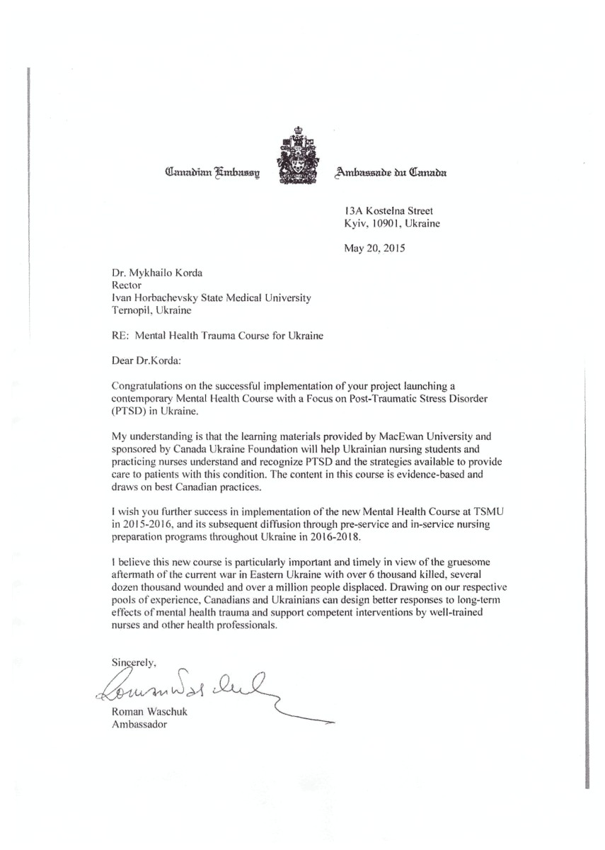 Вищезгаданий проект був підтриманий Надзвичайним і Повноважним Послом Канади в Україні Романом Ващуком.
