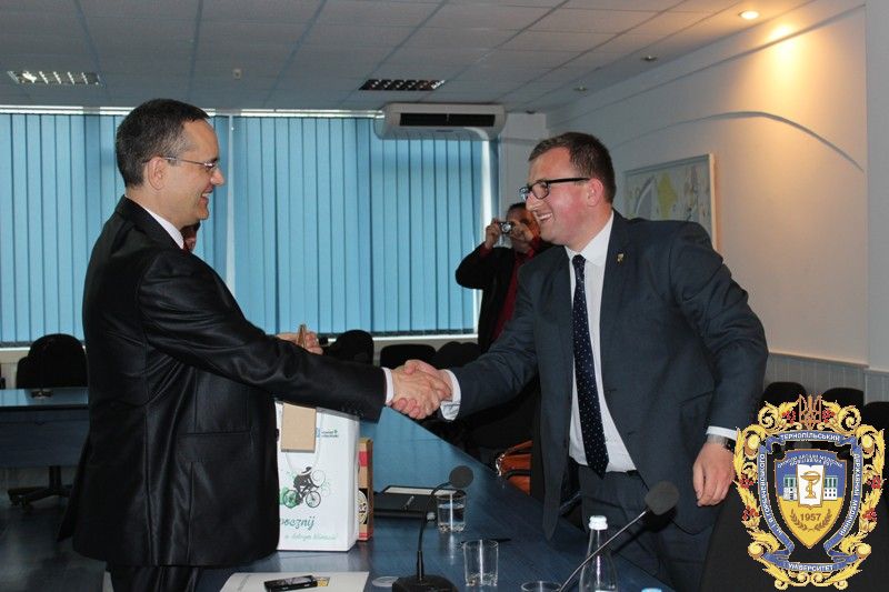 Під час роботи Всеукраїнської навчально-наукової конференції з міжнародною участю «Реалізація Закону України «Про вищу освіту» у вищій медичній та фармацевтичній освіті України» у Тернопільському державному медичному університеті імені І.Горбачевського 21 травня в конференц-залі навчально-оздоровчого комплексу «Червона калина» ректор Михайло Корда зустрівся із представниками польської делегації, зокрема старостою Суленцінського повіту Патріком Левицьким і начальником відділу освіту Емілією Пшибши.