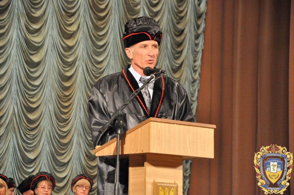 «Сьогодні у вас, шановні випускники, свято, яке буває лише раз у житті. Це свято має подвійне емоційне підгрунтя, адже у ньому поєднуються сум розлуки і світло надії, смуток прощання і радість зустрічі з майбутнім. Ви вступаєте у доросле життя, яке буде наповнене викликами і небезпеками, але, я впевнений, ви з гідністю з ними справитеся. Багато елементів студентського життя уже відійшло в минуле. Тепер не потрібно буде щоранку бігти на заняття, складати іспити, але водночас уже не буде виїздів на «Червону калину» і студентських вечорів. З багатьма своїми теперішніми друзями по студентській лаві ви знову можете побачитися через кілька років, коли приїдете на зустріч випускників.