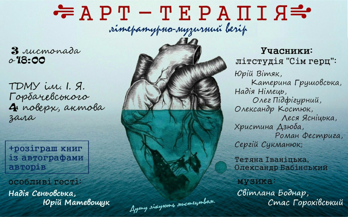 Студенти Тернопільського державного медичного університету імені І.Горбачевського не тільки сумлінно вчаться, беруть участь у громадській діяльності, реалізовують благодійні проекти, а й розвивають свої творчі здібності. 3 листопада о 18.00 в актовій залі ТДМУ майбутні медики продемонструють свої таланти під час неформального літературно-музичного вечора «АРТ-терапія».
