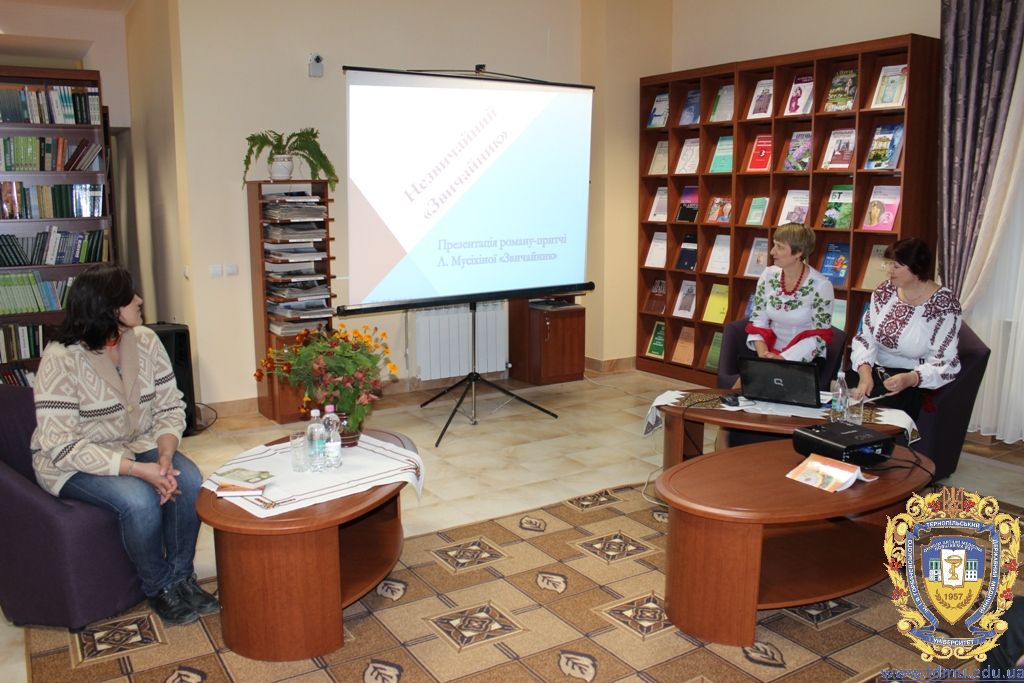 У бібліотеці Тернопільського державного медичного університету імені І.Горбачевського триває декада відкритих дверей, приурочена Всеукраїнському дню бібліотек, який відзначаємо щороку 30 вересня. Вчора, 21 вересня, тут відбулася зустріч з відомою тернопільською письменницею, етнографом та фольклористом, громадським діячем, відомим волонтером Лілією Мусіхіною, яка презентувала свою нову книгу – історичний роман-притчу «Звичайник». Гостя розповіла про історію його написання, про інші книги, видані раніше, а також поділилася спогадами про побачене і пережите на Євромайдані та досвідом волонтерської діяльності.