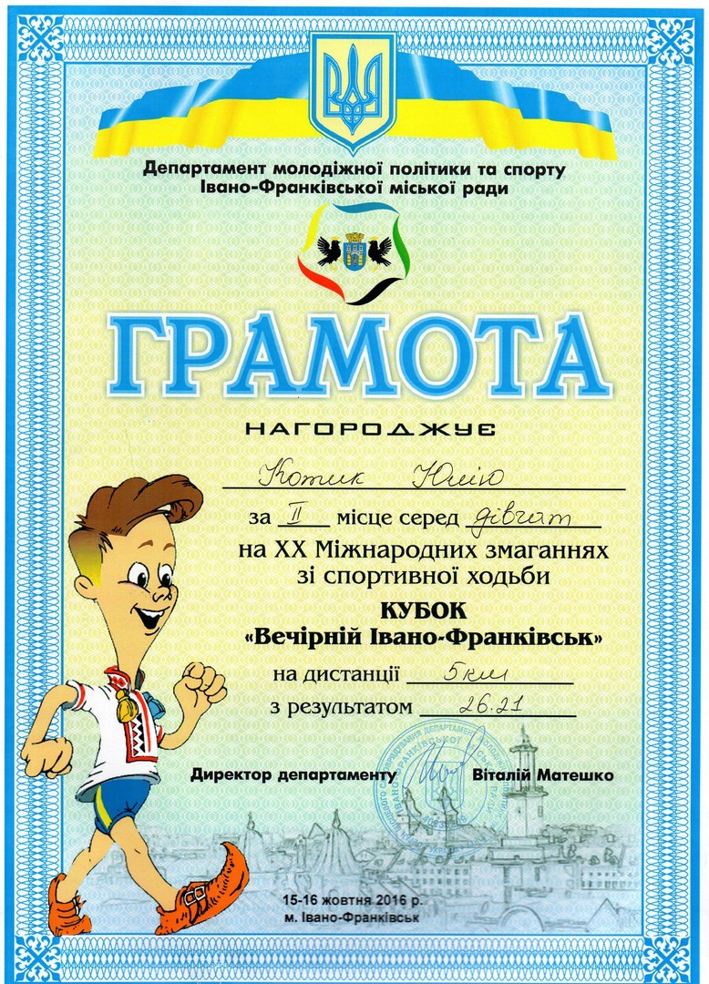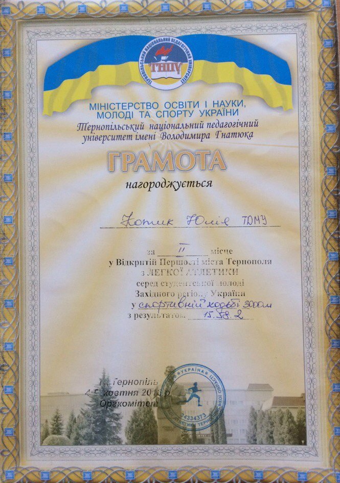 Студентка першого курсу медичного факультету Котик Юлія, яка навчається за спеціальністю «Фізична реабілітація», виборола друге місце серед 18 учасників, поступившись переможниці лише двадцятьма секундами. Проте це не єдина перемога нашої студентки. Так, 4-5 жовтня цього року відбулася відкрита першість міста Тернополя з легкої атлетики серед студентської молоді західного регіону України, на якій Юлія гідно представила наш університет, зайнявши 2 місце зі спортивної ходьби 3000 м.