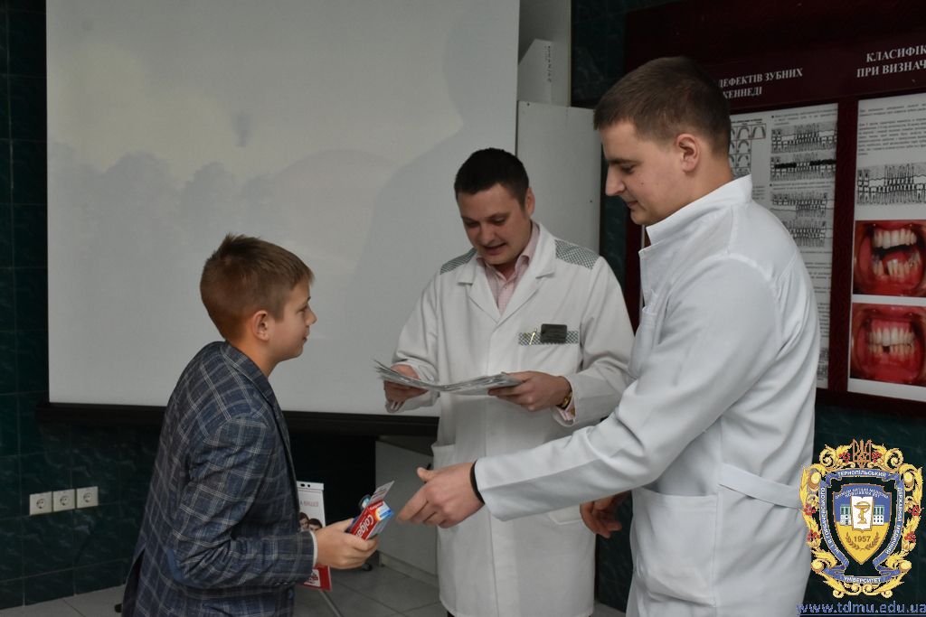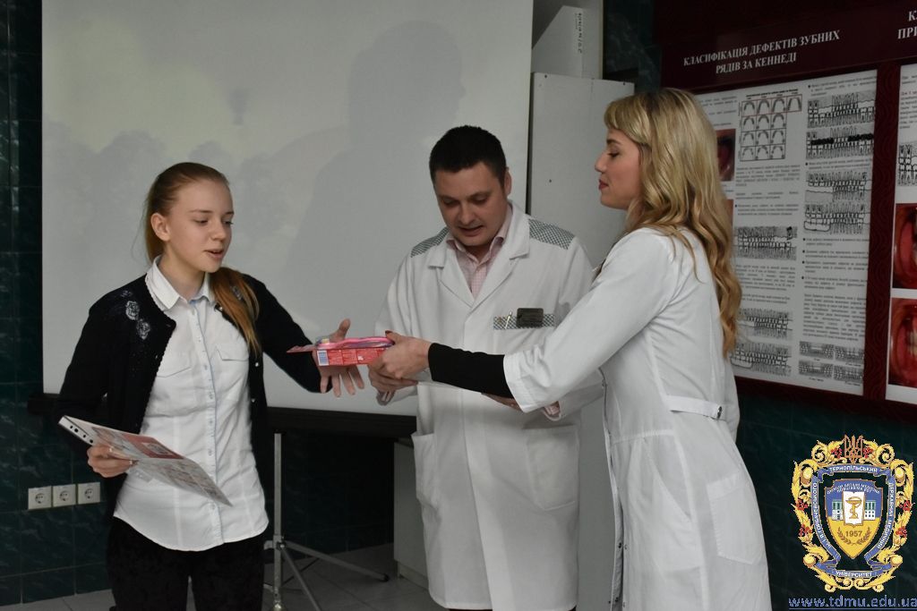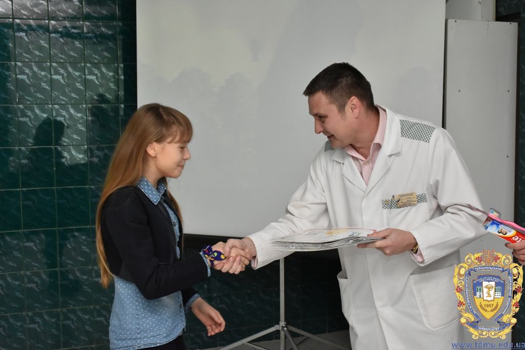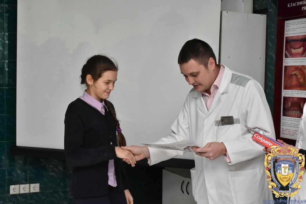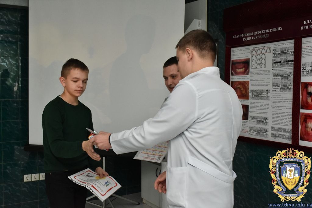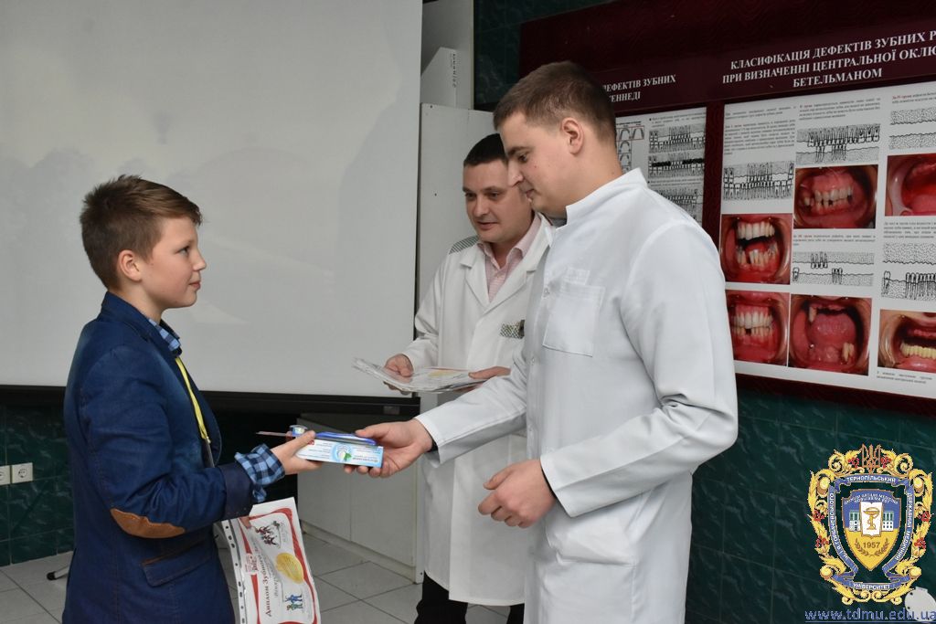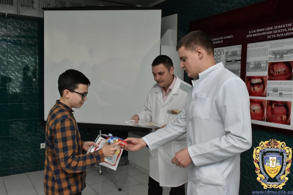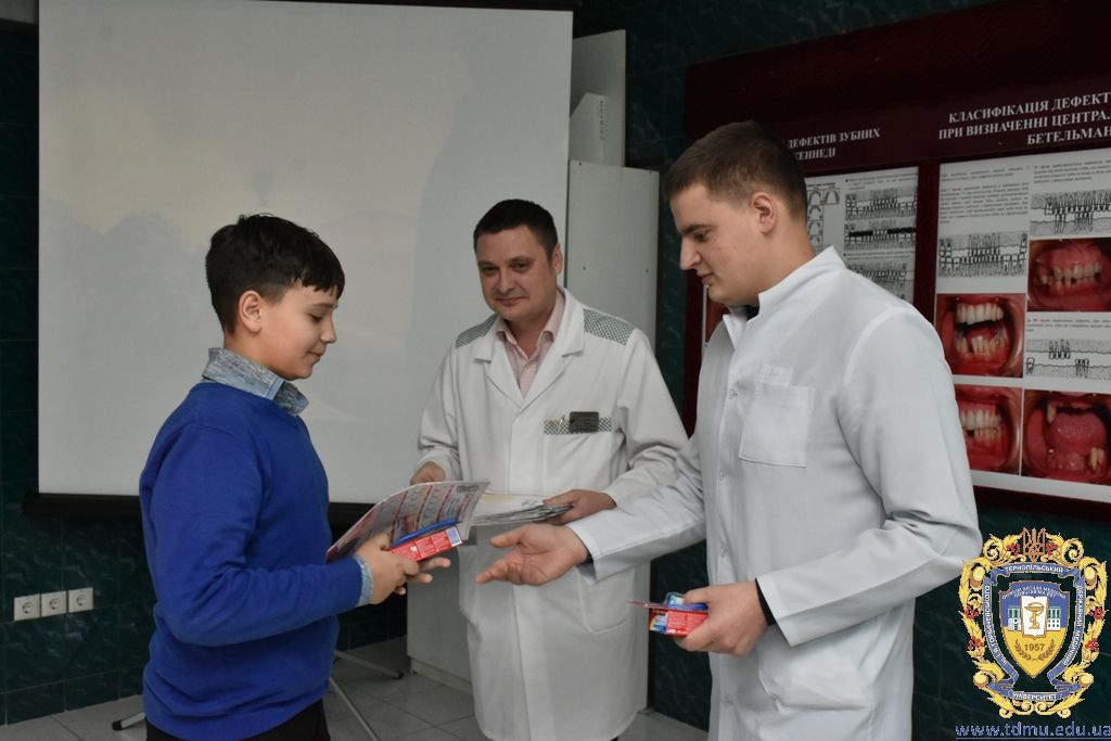 Після проведеного майстер-класу з догляду за ротовою порожниною гуртківцями кафедри та після профілактичних оглядів співробітниками кафедри кожному гімназисту були запропоновані зразки зубних паст, щіток, календарі чищення зубів, пам’ятки з догляду за порожниною рота. Також юні учасники дійства дали присягу «Зубних захисників» та отримали відповідні дипломи, адже діти повинні знати про важливість захисту зубів та ясен.