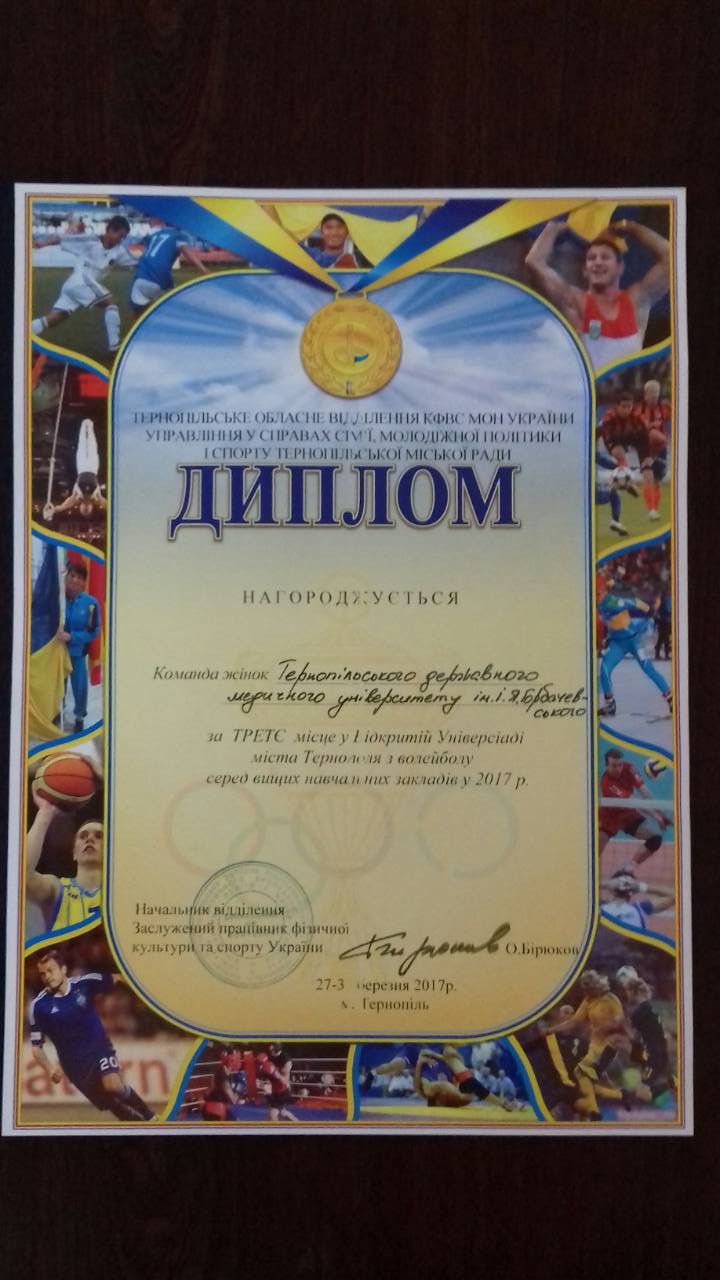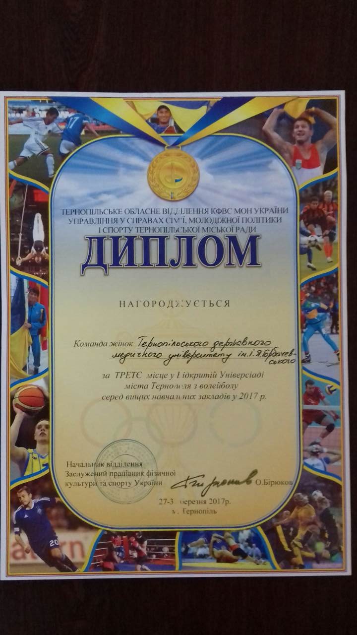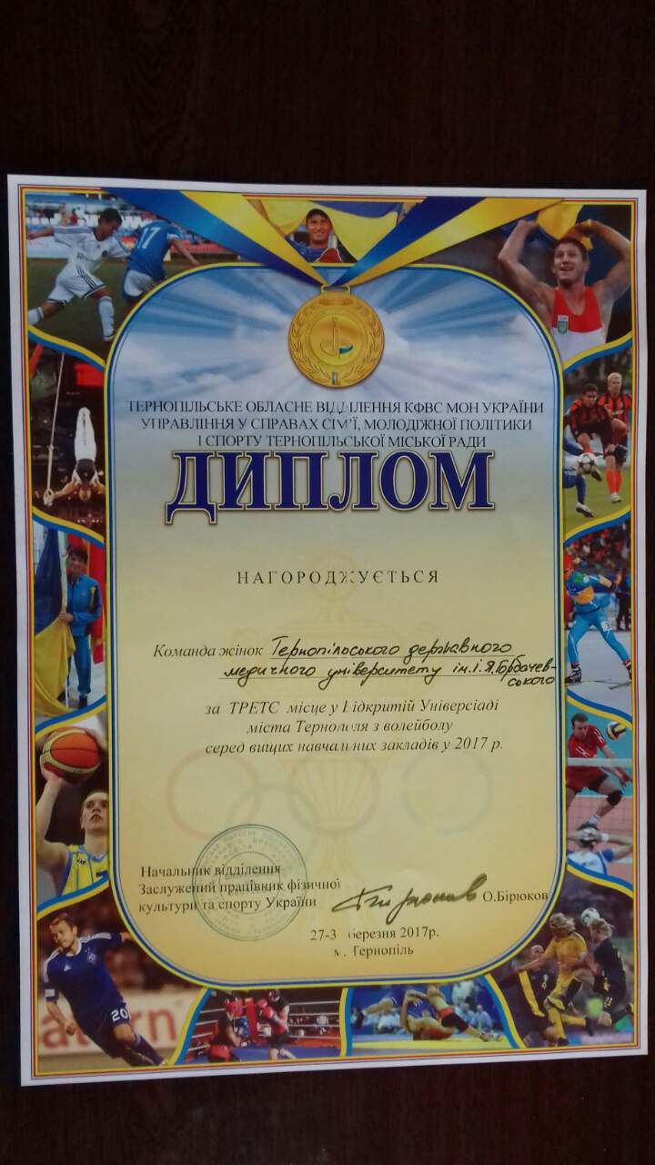 Студенти Тернопільського державного медичного університету імені І.Горбачевського, які цього року відстоюють честь вишу в Універсіаді, продовжують тішити своїми перемогами. Отже, 29 березня 2017 року в спорткомплексі Тернопільського національного економічного університету відбулися змагання з волейболу серед жіночих команд. Змагання проходили у рамках відкритої Універсіади міста Тернополя управління у справах сім’ї, молодіжної політики і спорту Тернопільської міської ради та Тернопільського обласного відділення Комітету з фізичного виховання та спорту МОН України.
