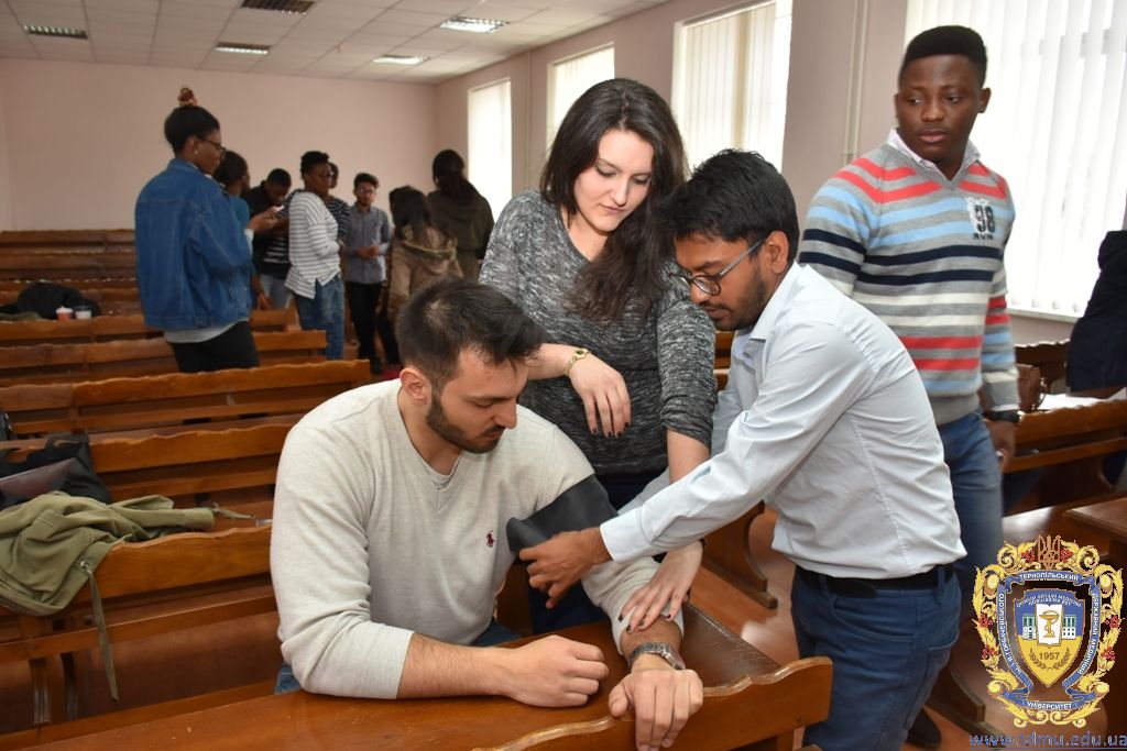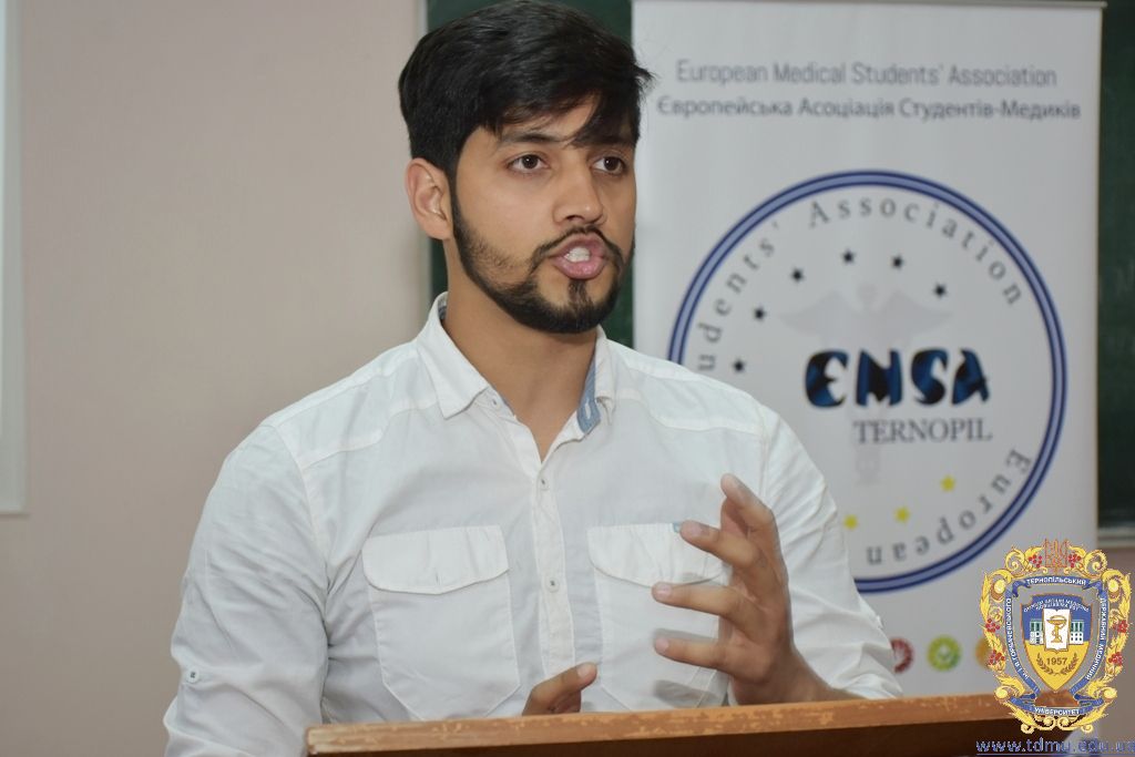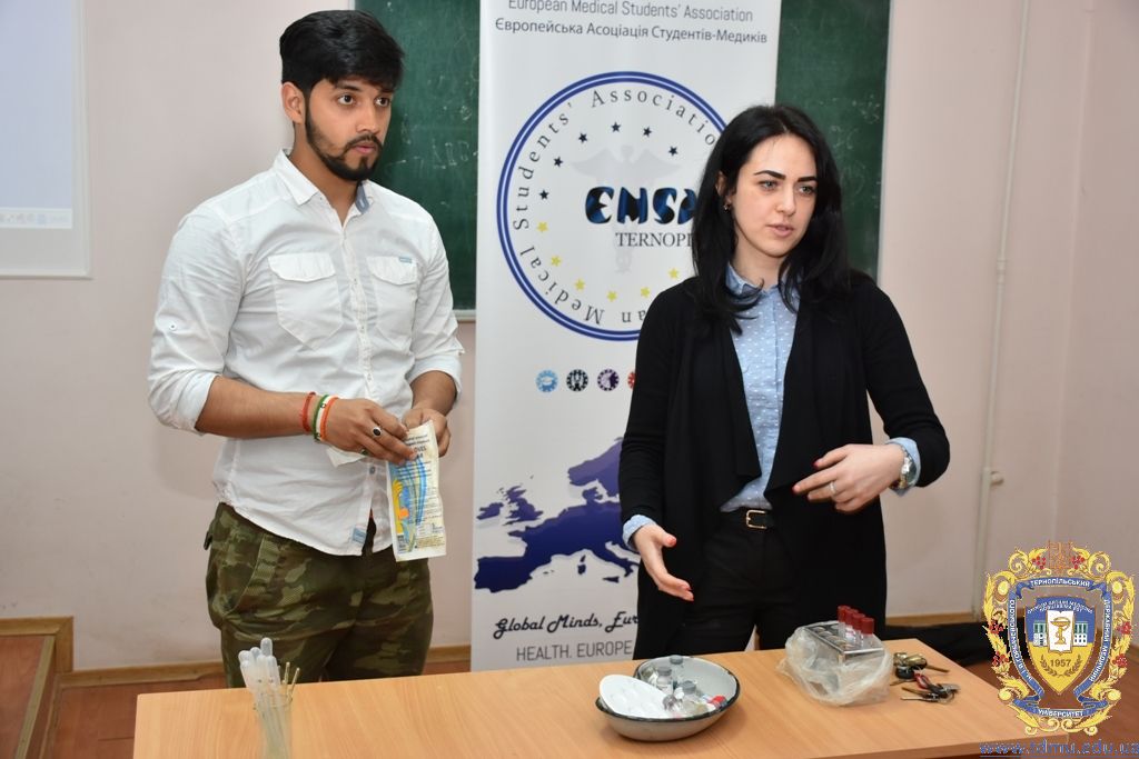 Під час першої частини засідання студенти ТДМУ взяли участь у майстер-класі з зупинки різних видів кровотеч, який провела Наргіз Джавадова. Нагадаємо, що Наргіз є членом молодіжного крила Всеукраїнської ради реанімації та екстреної медичної допомоги, яке діє в ТДМУ. Після майстер-класу члени ЄМСА взяли участь у короткій вікторині, присвяченій темі гемофілії.