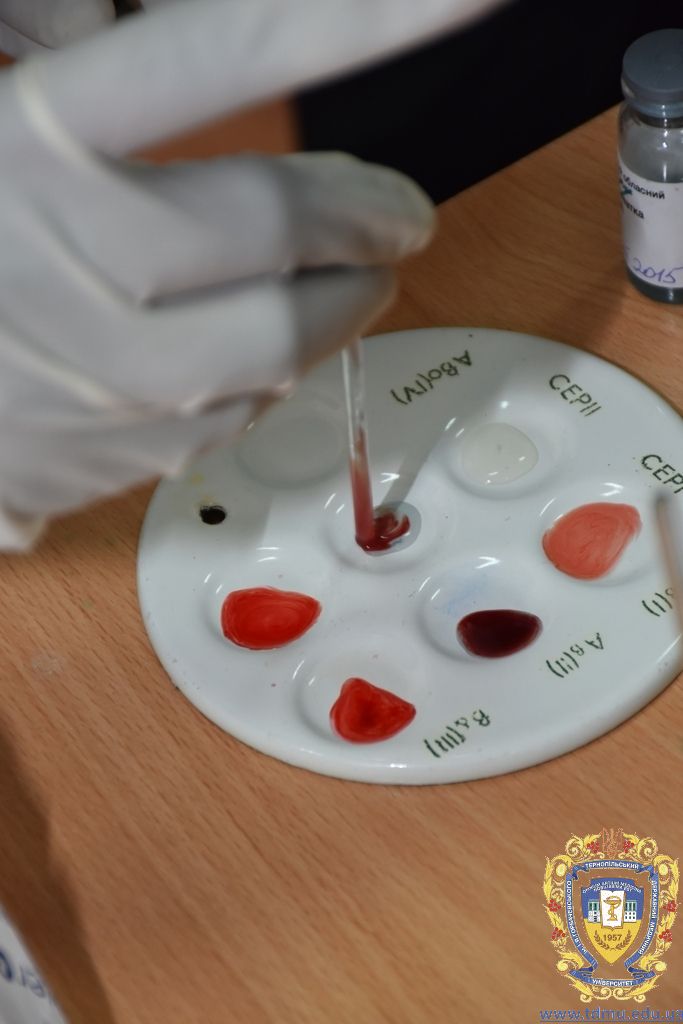 Асистент кафедри нормальної фізіології Людмила Татарчук продемонструвала методи визначення групи крові, зокрема присутні ознайомилися зі стандартним методом та методом з використанням моноклональних реагентів анти-А і анти-В.