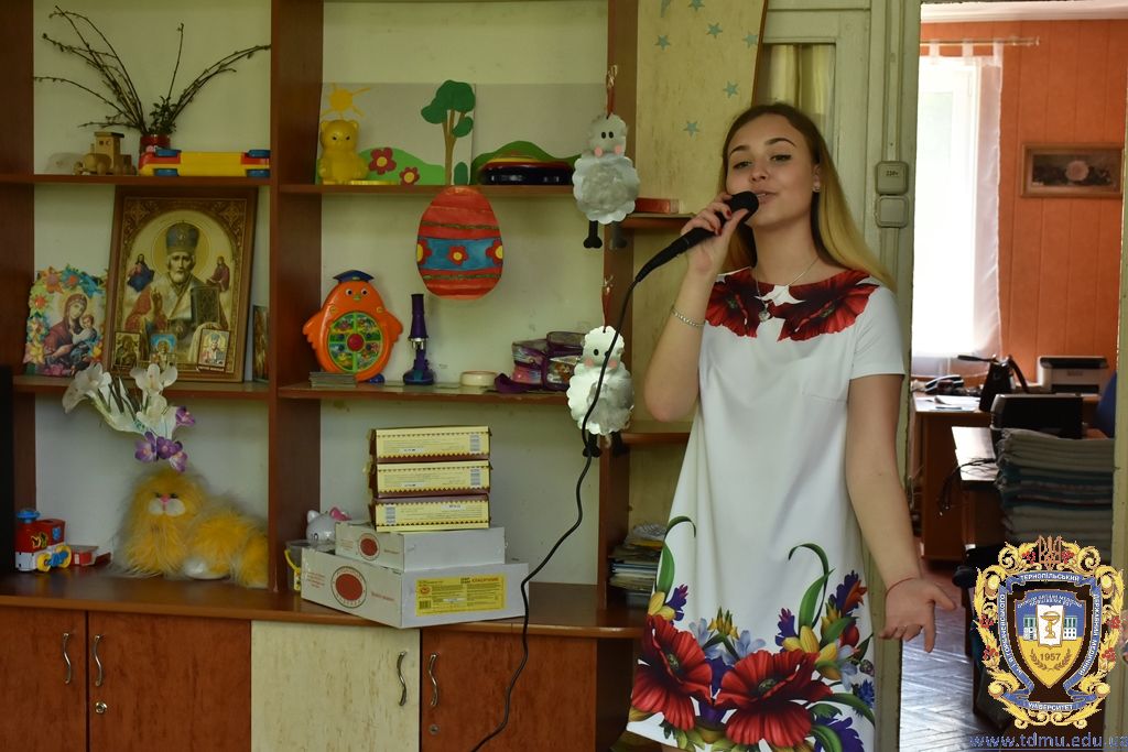 Гості приготували також пісенні подарунки. Веселі, життєрадісні і дуже мелодійні пісні прозвучали у виконанні студенток першого курсу фармацевтичного факультету Тетяни Лемішки, Ірини Роговської та студентки першого курсу медичного факультету з Польщі Анни Яніцької. Діти підспівували виконавцям.