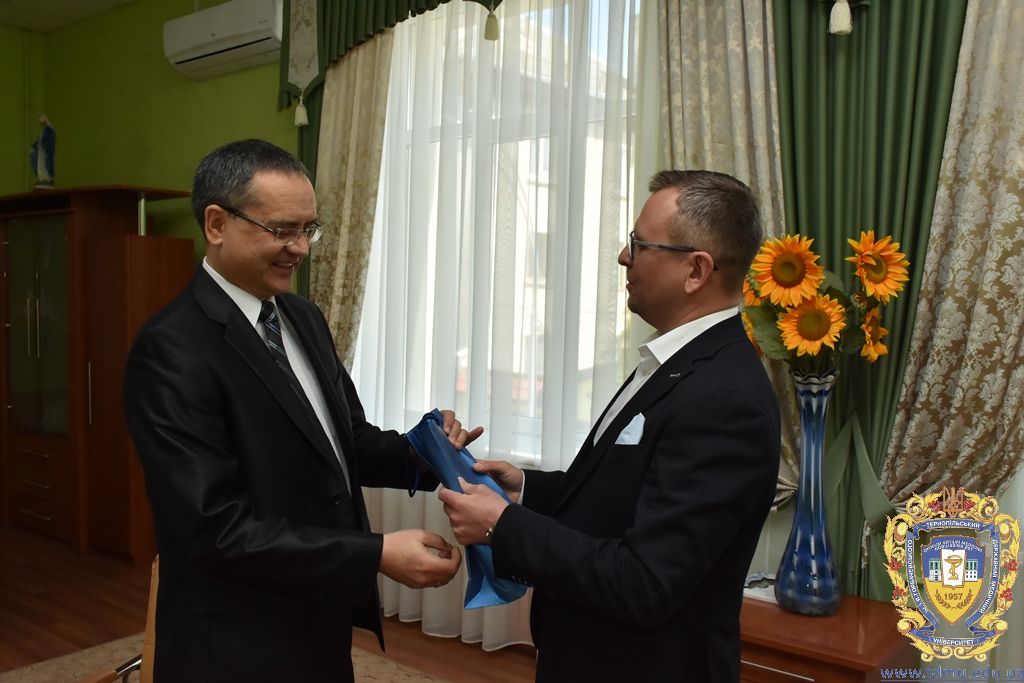 У рамках свого перебування професор Пйотр Млинаж зустрівся з ректором ТДМУ, професором Михайлом Кордою з метою обговорити можливі напрямки і перспективи міжнародної співпраці між Тернопільським державним медичним університетом імені І.Горбачевського та Вроцлавським технічним університетом (Польща).