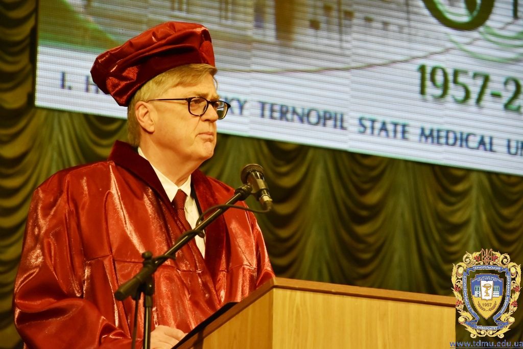 «Це велика честь, якої удостоїв мене Тернопільський державний медичний університет сьогодні. Я пам’ятатиму про це дуже довго. Водночас для мене велика честь перебувати сьогодні на святкуванні. Вітаю вас з цим ювілеєм. Між Канадою та Україною довга і спільна історія. Як громадяни Канади, ми маємо великий борг перед всіма українцями, оскільки українські емігранти багато зробили для нашої країни, коли вони почали освоювати Захід Канади. Ця історія триває досі – українці продовжують збагачувати нашу країну. Я сьогодні виконую ще одну місію – висловлюю вдячність за внесок українців у розвиток Канади. Такі святкування дають можливість згадати минуле. Сьогодні ви можете побачити, як зріс ваш університет за ці роки. Всі, хто працював і навчався тут, доклав свою частку душі до цього поступу. Це важливе надбання. Ваша репутація в Україні і за кордоном вражаюча. Однією з ознакою якості є кількість іноземних студентів, які приїжджають сюди навчатися. Ваш університет має бачення майбутнього, адже будує дружні стосунки з багатьма університетами в інших країнах. Ми співпрацюємо упродовж багатьох років. Ця співпраця принесла багато корисного обом нашим установам. Ще раз вітаю вас від імені всього Університету імені Грента Мак Юена», – зазначив у своєму виступі Девід Аткінсон.