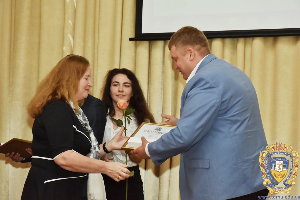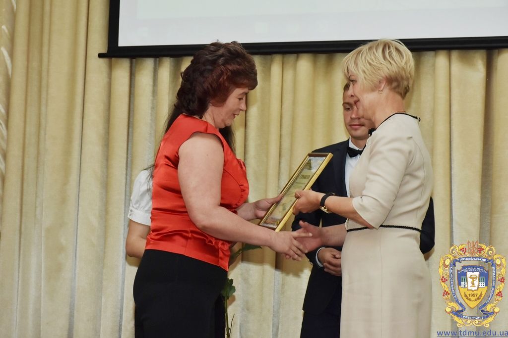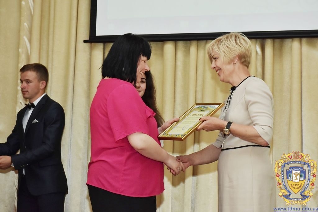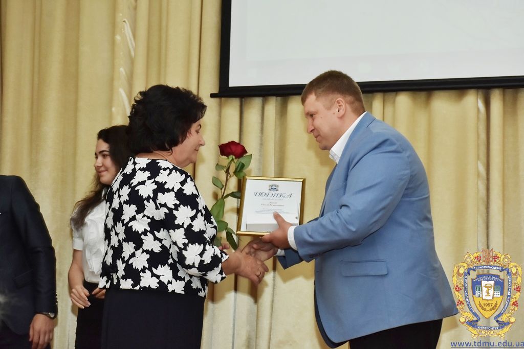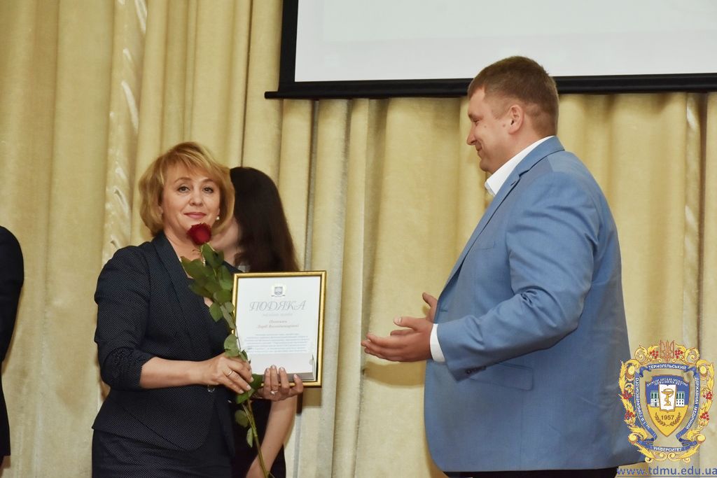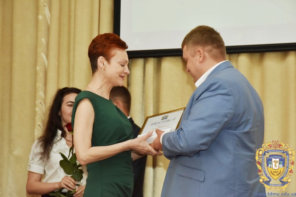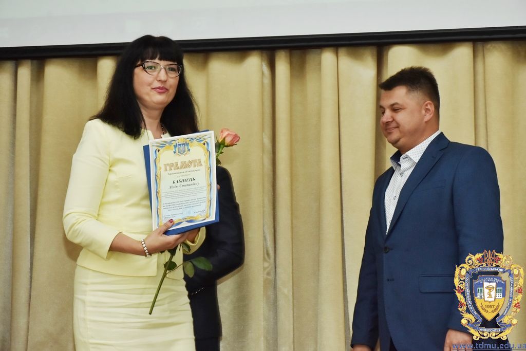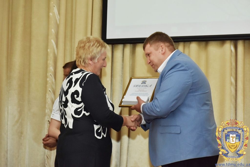 З вітальним словом виступила заступник начальника відділу охорони здоров’я та медичного забезпечення Тернопільської міської ради Ольга Ярмоленко. Вона вручила грамоти відділу доценту кафедри анатомії людини Ігорю Боймиструку, асистенту кафедри загальної хімії Лесі Гнатишиній, доценту кафедри фармакогнозії з медичною ботанікою Ірині Дахим, інспектору деканату медичного факультету Лілії Дедьо, асистенту кафедри патологічної фізіології Олені Кулянді, доценту кафедри клінічної фармації Зої Мандзій, техніку з експлуатації автотранспорту Петру Олійнику, доценту кафедри фармації навчально-наукового інституту післядипломної освіти Оксані Онишків, асистенту кафедри медичної біохімії Лілії Палиці, доценту кафедри філософії та суспільних дисциплін Ользі Христенко, доценту кафедри дитячих хвороб з дитячою хірургією Наталії Щербатюк, лаборанту кафедри дитячої стоматології Оксані Яворській.
