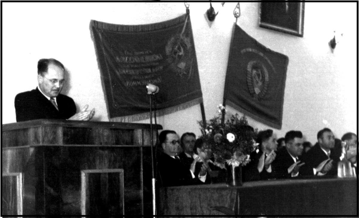 Фото 2. П.О. Огій виступає в актовій залі на урочистому засіданні, присвяченому відкриттю Тернопільського медичного інституту. Перший від трибуни – секретар обкому партії М.О. Петрик, четвертий – голова облвиконкому В.В. Лисенко, п’ятий – перший секретар обкому КПУ Г.І. Шевчук. 22 вересня 1957 року.