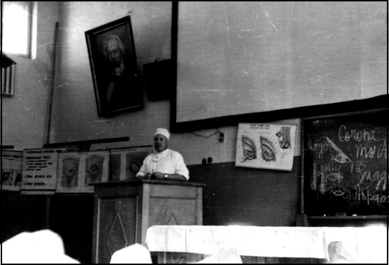 Фото 9. Петро Омелянович читає студентам лекцію на тему “Хірургічне лікування гриж” в аудиторії обласної лікарні. 1968 рік.