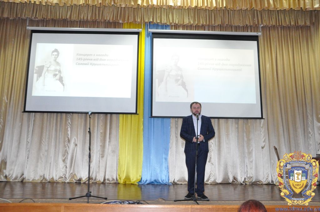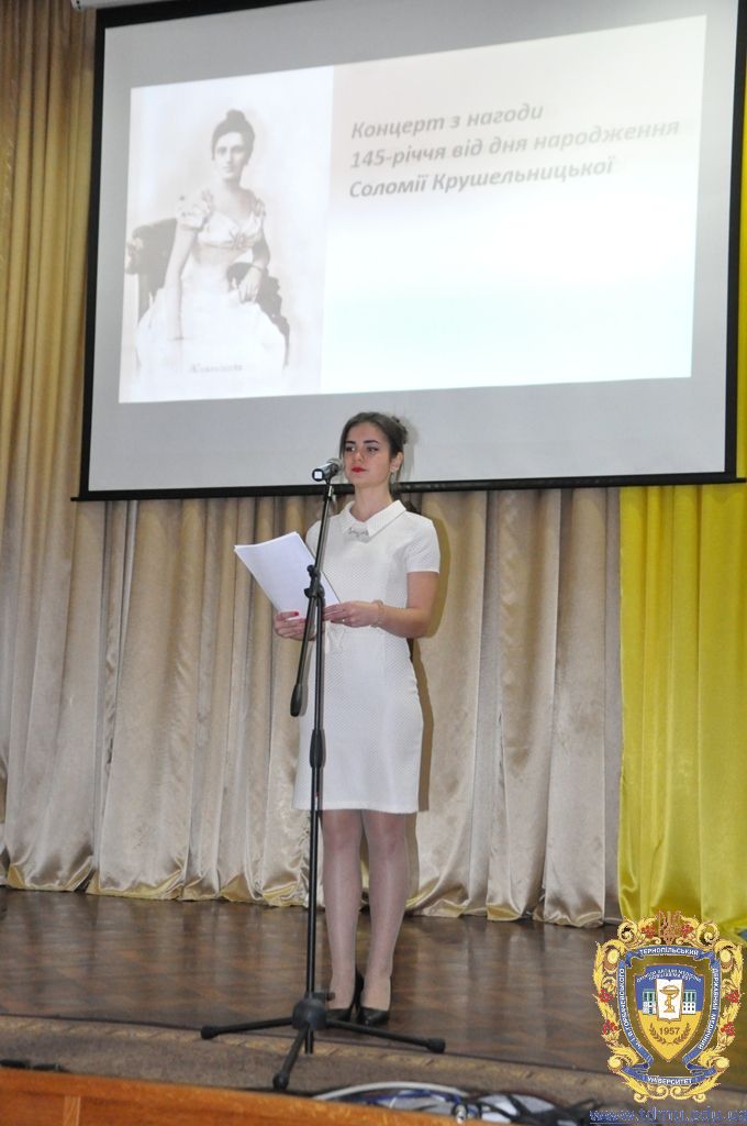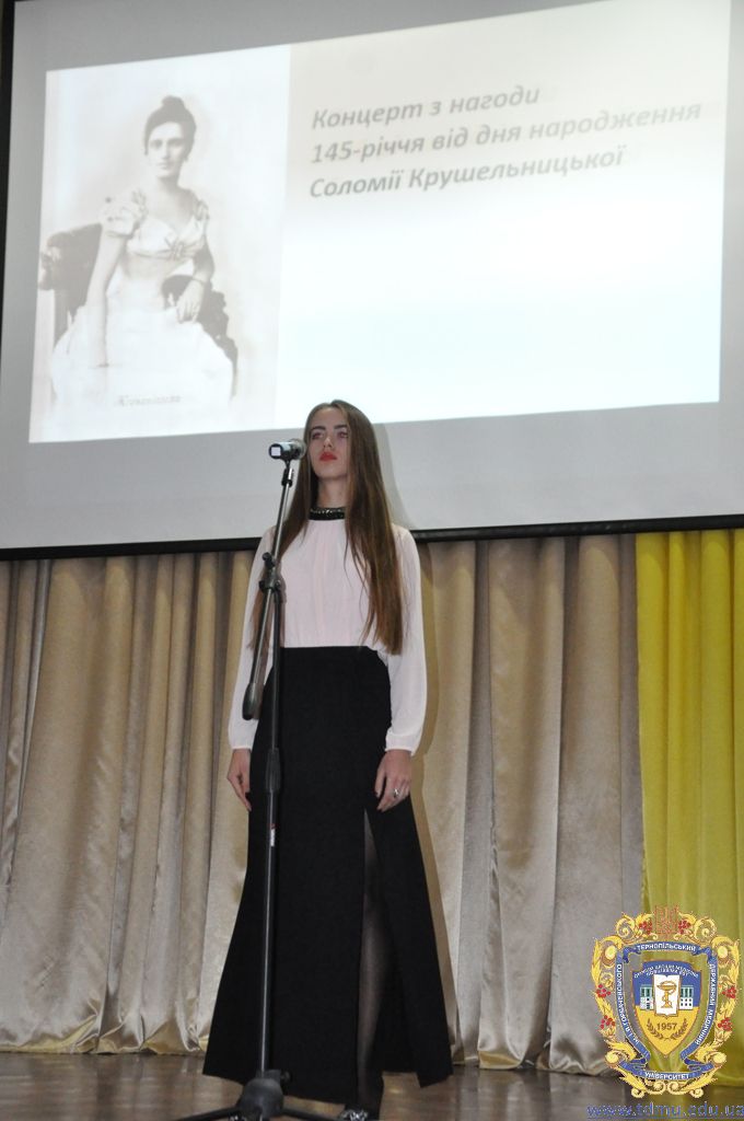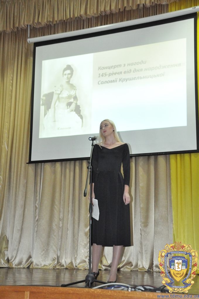 З ініціативи викладачів кафедр загальної гігієни та екології і медичної біохімії Тернопільського державного медичного університету імені І.Горбачевського нещодавно відбувся концерт класичної музики в актовій залі адміністративного корпусу. Захід був присвячений 145-річчю з дня народження видатної співачки Соломії Крушельницької, яка прославила своїм голосом Україну у всьому світі.
