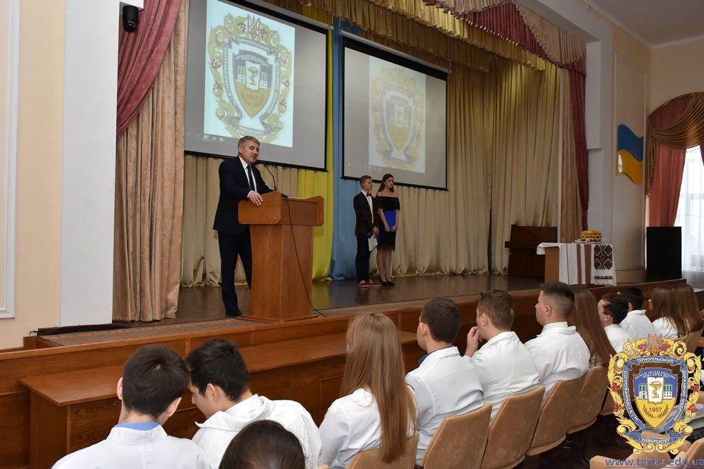 «Шановні учні, педагоги, батьки! Ми раді вітати вас в стінах нашого університету, – звернувся до присутніх проректор з навчально-педагогічної роботи, професор Аркадій Шульгай. – Насамперед, хочу передати найщіріші вітання від ректора, професора Михайла Михайловича Корди та побажати вам успіху на шляху здобуття медичної професії».