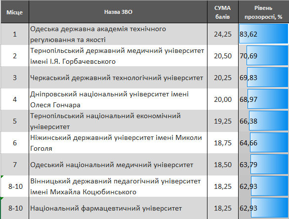 Тернопільський державний медичний університет імені І.Горбачевського посів друге місце серед 202 ВНЗ, які брали участь у дослідженні. Рівень прозорості ТДМУ становить 70,69%, а загальна сума балів – 20,50. Максимальна сума балів, яку міг набрати той чи інший вищий навчальний заклад, становить 29.
