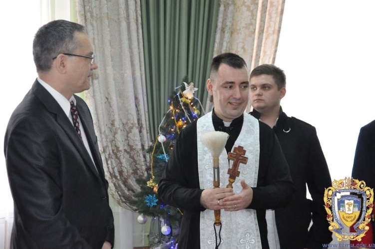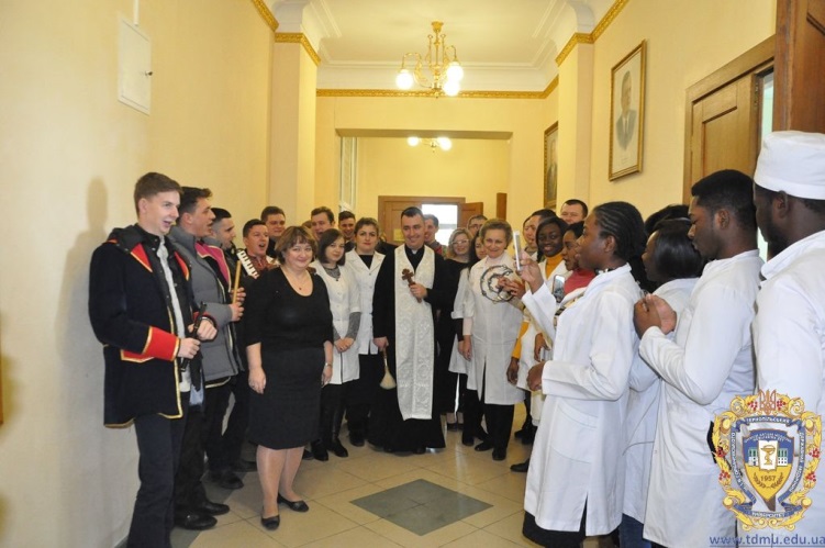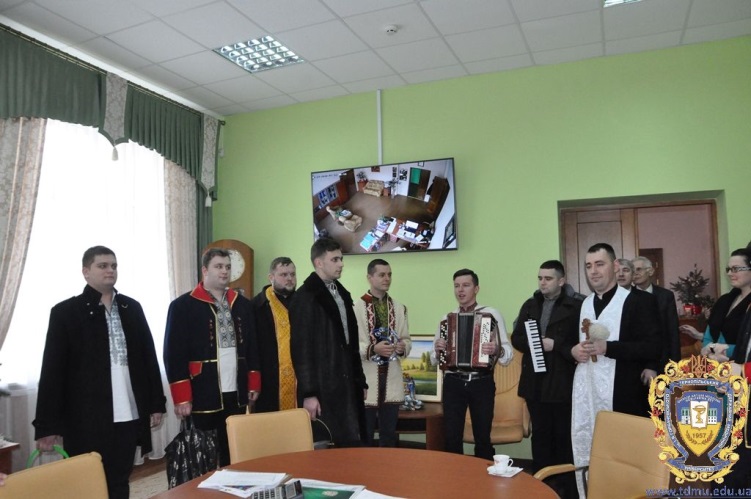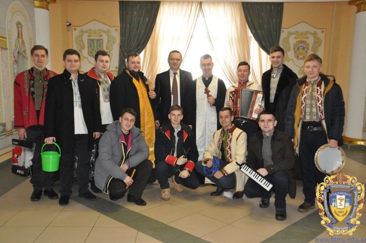 Префекти Тернопільської вищої духовної семінарії імені патріарха Йосифа Сліпого отець Ігор Драпак та отець Януарій Твердун разом зі своїми вихованцями 23 січня 2018 року щиро вітали викладацький та студентський колектив Тернопільського державного медичного університету імені І.Горбачевського з минулими святами та Йорданським водосвяттям.