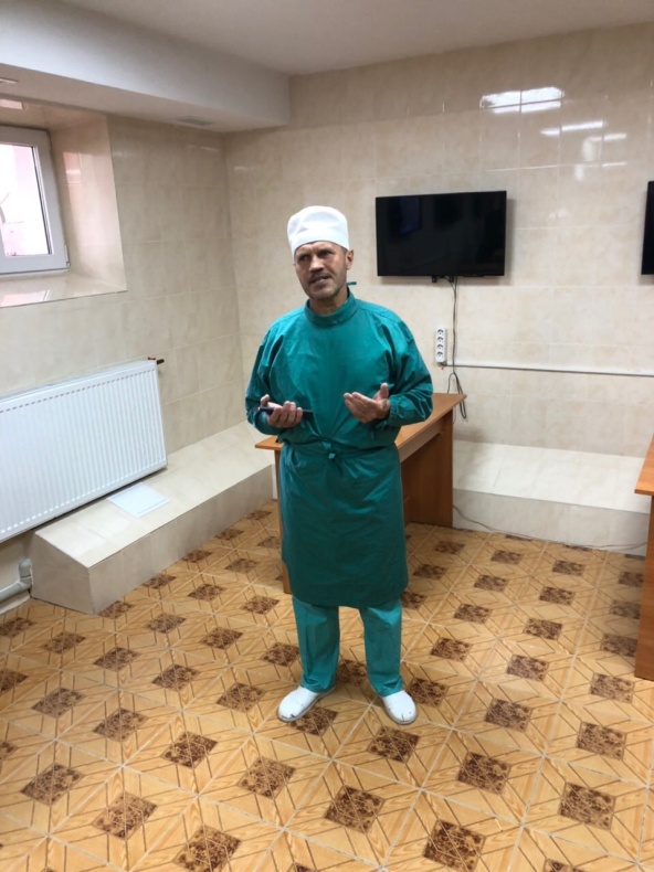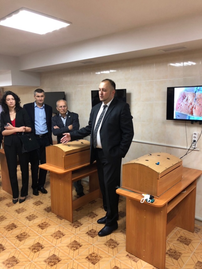Безпосередньо з роботою центру присутніх ознайомив викладач кафедри – асистент Походун К.А., продемонструвавши під час екскурсії практичні можливості, які пропонує студентам центр малоінвазивних операційних технологій. Зокрема, практичні навички, основані на принципі тренінгу, імітації, моделювання, дають студентам та курсантам можливість здобути правильні уміння без ризику для життя пацієнта, завдяки багаторазовим тренінгам знижується кількість помилок у виконанні маніпуляцій та оперативних втручань.