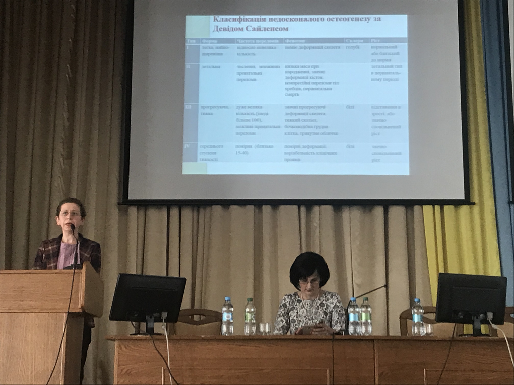 Доцент кафедри дитячих хвороб Київського медичного університету Наталія Балацька охарактеризувала основні ланки патогенезу, клініки, класифікації недосконалого остеогенезу, ознайомила присутніх з базовими принципами терапії.