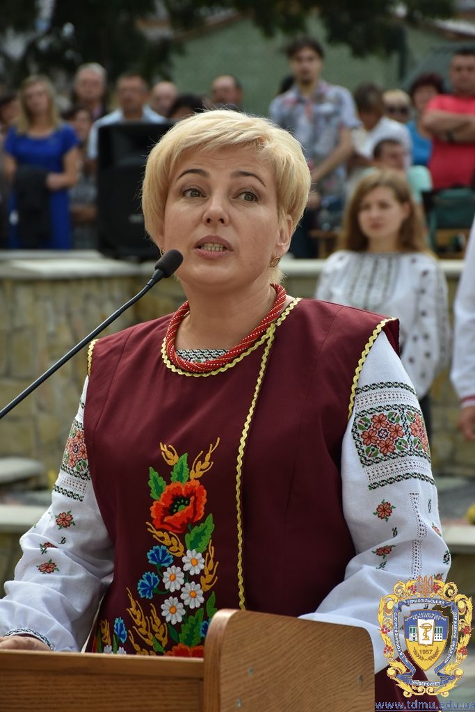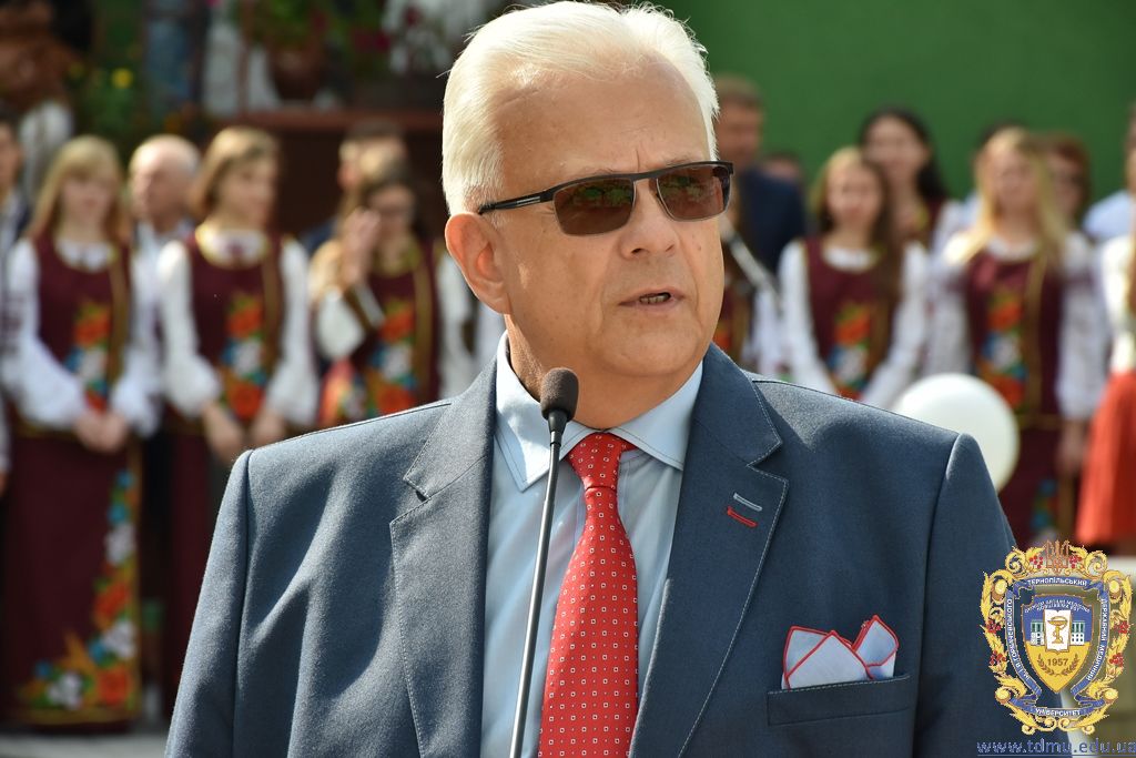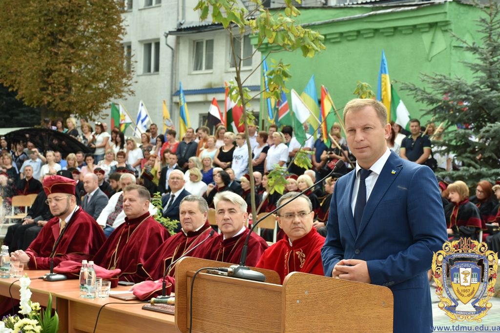 «Для кожного з вас сьогодні особливий день. Цей день є хвилюючим для студентів і для вас, шановні батьки, адже зараз вас переповнює гордість за своїх дітей, які обрали лікарський фах і стали студентами одного з кращих вишів нашої країни. Для вас, студенти, цей день особливий тим, що ви робите важливий крок до свого дорослого самостійного життя. Початок осені важливий і для міста, адже змінюється його ритм життя. Тисячі молодих людей наповнюють вулиці – і Тернопіль перетворюється на студентське місто. Хочу сказати, що ви зробили правильний вибір, тому що Тернопільський медичний університет сьогодні один з кращих вишів України і є гордістю міста. Університет бере активну участь у громадському житті Тернополя і його розвитку. Виш має прекрасну матеріально-технічну базу, яка з кожним роком вдосконалюється. Має добру наукову базу. Лише упродовж останніх шести років запатентовано кілька нових винаходів. Науковцями і викладачами пишається не лише Україна, а й знають їх за кордоном.