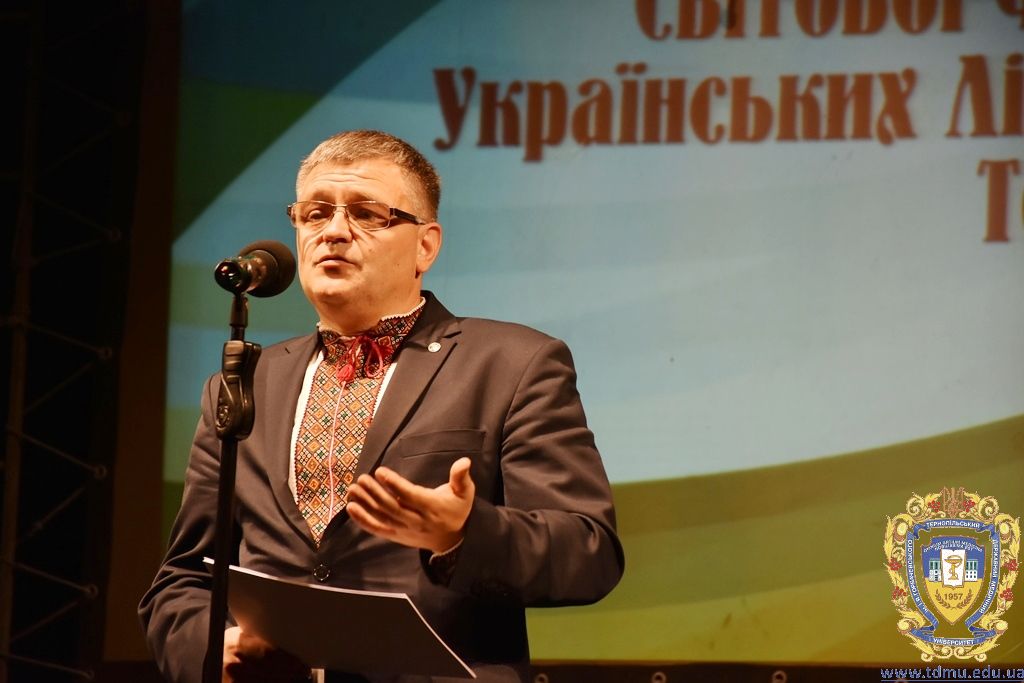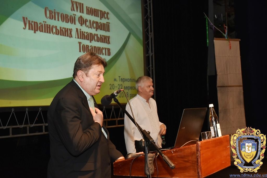 «Щиро вітаю від всього викладацького колективу і студентської родини університету учасників XVII Конгресу Світової федерації українських лікарських товариств. Ми пишаємося тим, що така знакова подія для всіх українських лікарів цього року відбувається на Тернопіллі, зокрема на базі нашого університету. Тернопільщина – це благодатний край, який багатий на таланти, в тому числі і на лікарські. Нам є ким і чим пишатися. Самовіддана праця багатьох наших лікарів, вчених-медиків стала відомою не тільки в нас, а й далеко за її межами. Так склалося історично, що багато наших лікарів і вчених не змогли реалізувати себе тут, вони працювали і працюють на чужині, вдосконалюються там і роблять відкриття, винаходи, які входять до скарбниці світової медицини. Так було упродовж тривалого історичного періоду.