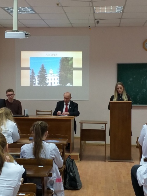 Студент Олексій Яцюк доповів присутнім про історію Гусятинського району та його видатних уродженців. Студентка Олена Баран представила присутнім цікаву презентацію про Зборів.