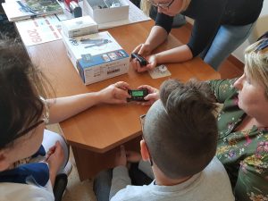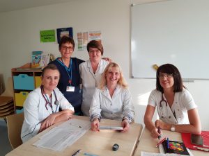 Вікторія Фурдела з працівниками відділення: ординатор Katarzyna Jakubek Kipa, керівник відділення Lucyna Lisowicz, стоять головна медсестра відділення Marta і викладач школи діабету Bozena.