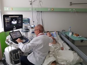 Консультант відділення Dr n. med. Mariusz Ostański проводить ехокардіоскопію в динаміці хворому з ендокардитом в палаті відділення.