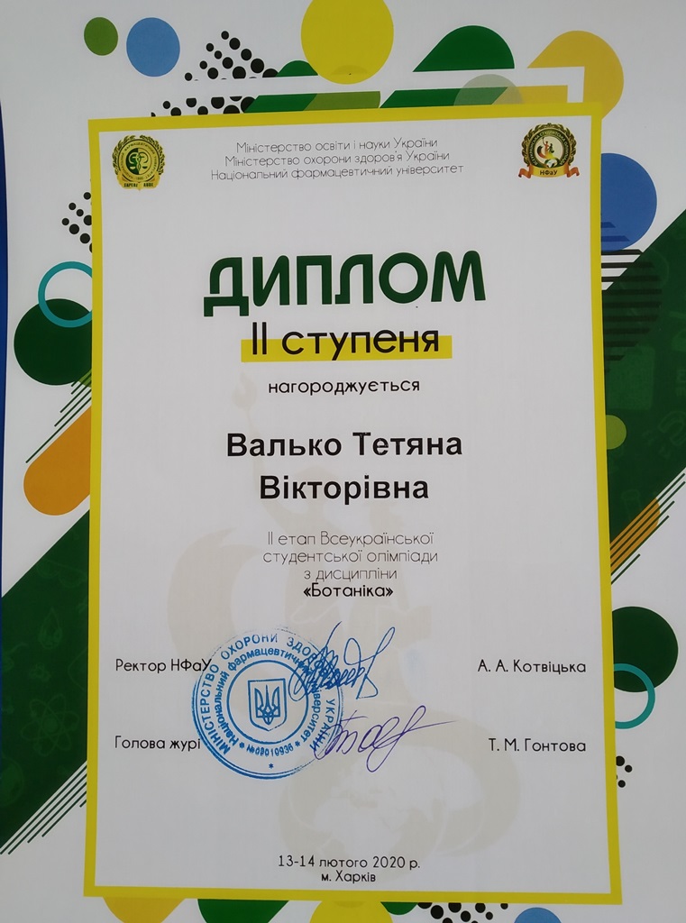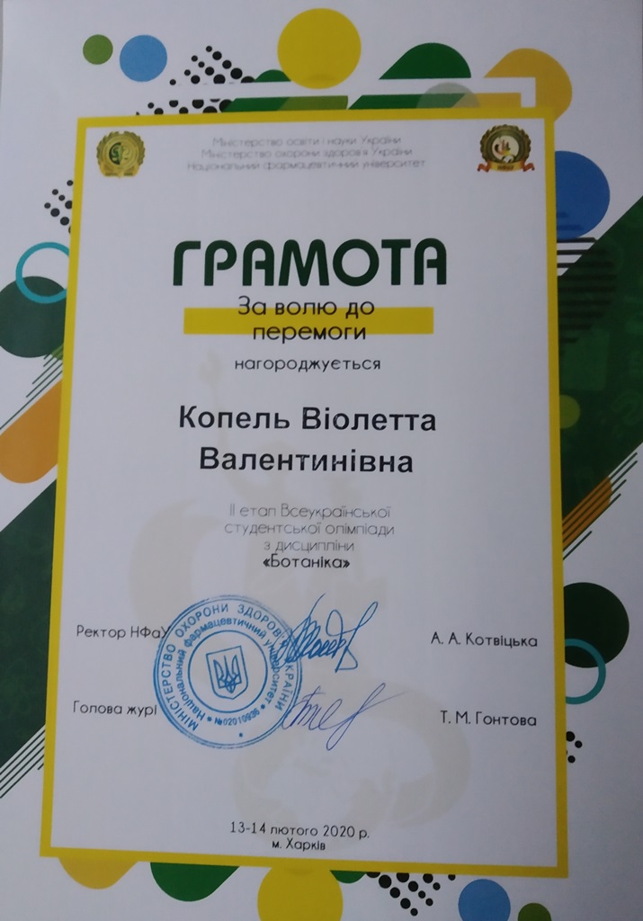 13-14 лютого 2020 року на базі Національного фармацевтичного університету (Харків) відбувся ІІ етап Всеукраїнської студентської олімпіади з фармацевтичної ботаніки. Від Тернопільського національного медичного університету в олімпіаді взяли участь дві студентки третього курсу фармацевтичного факультету – Валько Тетяна і Копель Віолетта. Вони доклали чимало зусиль, щоб продемонструвати належний рівень знань з цієї дисципліни (викладання здійснюється на кафедрі фармакогнозії з медичною ботанікою; завідувач кафедри – проф. Марчишин С.М.).
