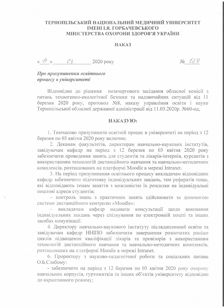 Відповідно до рішення позачергового засідання регіональної комісії з питань техногенно-екологічної безпеки та надзвичайних ситуацій при Тернопільській облдержадміністрації, яке відбулося 11 березня 2020 року, в Тернопільському національному медичному університеті призупинено навчальний процес. Такі заходи вжито згідно з урядовими рішеннями, яких необхідно дотримуватись через загрозу епідемії коронавірусної інфекції в Україні та для недопущення поширення COVID-19. Деальніше у наказі ТНМУ.