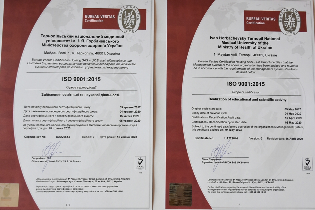 Нагадаємо, що 26 травня 2017 року Тернопільський медуніверситет за результатами сертифікаційного аудиту, проведеного зовнішніми аудиторами компанії Бюро Верітас Сертифікейшн Україна, вперше отримав сертифікат і гравертон міжнародного стандарту ISO 9001:2015 (управління якістю) за здійснення освітньої та наукової діяльності відповідно до вимог міжнародних стандартів.