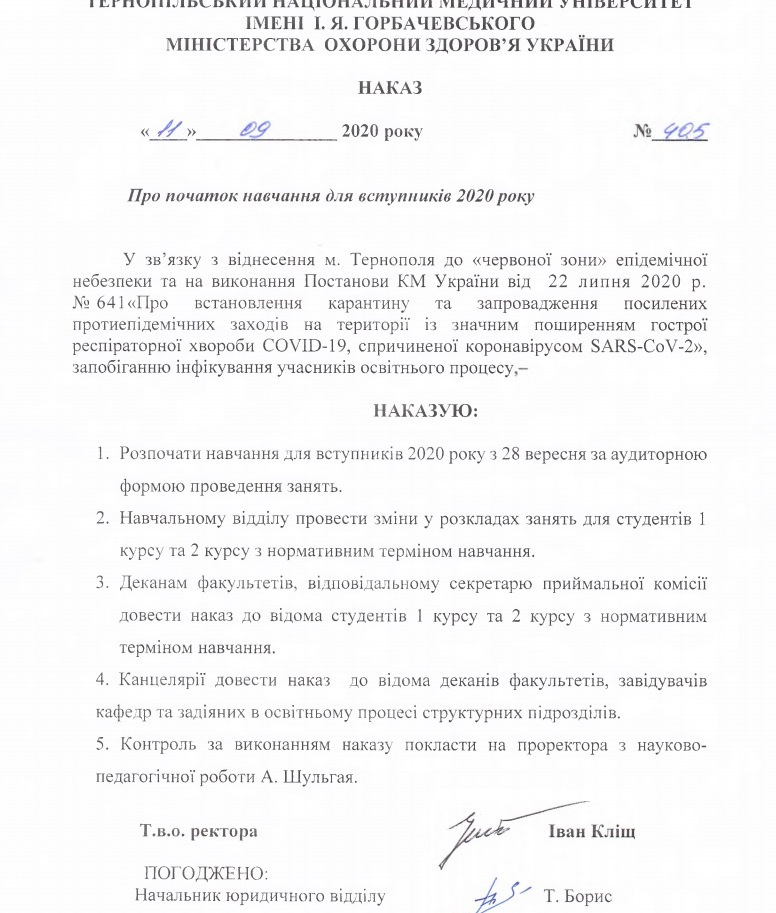 У зв’язку з тим, що місто Тернопіль перебуває у «червоній зоні» епідемічної небезпеки та для запобігання інфікування учасників освітнього процесу, навчання для студентів 1 курсу, а також 2 курсу з нормативним терміном навчання розпочнеться з 28.09.2020 року Про початок навчання для вступників 2020 року.