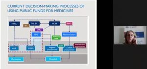 Доповідач охарактеризувала результати аналізу існуючих переліків лікарських засобів, за якими наразі реімбурсуються кошти, і схематично окреслила поточний процес прийняття рішень щодо використання бюджетних коштів на закупівлю лікарських засобів. Рабією Кахведжі було наголошено, що необхідно уніфікувати наявні в Україні переліки, методи і стратегію відбору ЛЗ з метою створення єдиного позитивного переліку на основі принципів доказової медицини, що дозволить забезпечити кращу ефективність і прозорість системи медичного забезпечення населення якісними, ефективними та доступними лікарськими засобами.