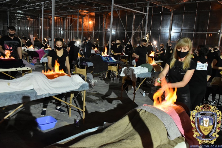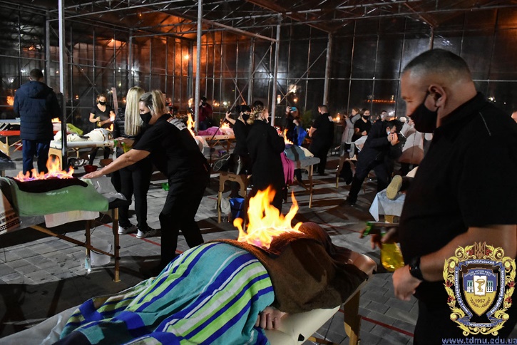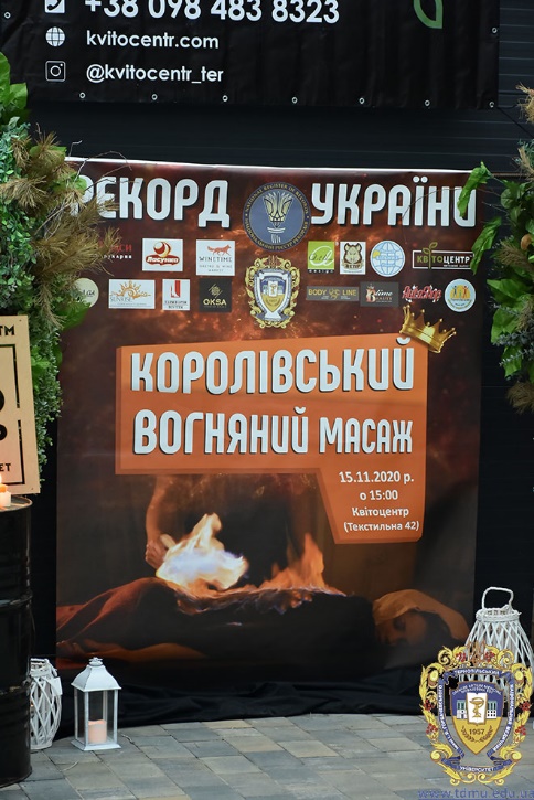 Організатором рекорду України з «Королівського вогняного масажу» став Тернопільський національний медичний університет імені І.Горбачевського, а саме представники кафедри фізичної терапії, ерготерапії та фізичного виховання – зав. Кафедри, проф. Попович Д.В., доц. Давибіда Н.О., доц. Коваль В.Б. та ас. Бондарчук В.І. У встановленні рекорду брали участь студенти медичного факультету, які навчаються за спеціальністю «Фізична терапія, ерготерапія»: Чуй Анастасія, Янечко Ксенія, Грабик Ірина, Занік Марта, Івасюк Алеся, Кондратюк Валерія, Чернякова Оксана, Ніштун Ігор, Музика Анастасія, Тивонюк Анастасія, Трощанський Василь, Панкратьєв Олег, Маценько Вова, Біяк Юлія, Ганчак Тетяна, Прокопа Віталій та Піган Вікторія.